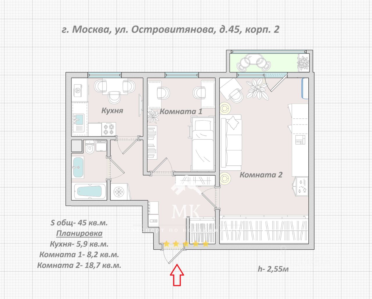 2-к, Островитянова, 45 корп. 2