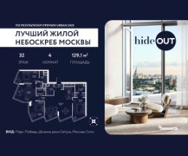 Прямая продажа от застройщика. Продается 4-комнатная квартира площадью 129.1 кв.м. на 1-м этаже 34-этажного дома в ЖК hideOUT с панорамными видами: Парк Победы, Долина реки Сетунь, МГУ, Москва-Сити, Воробьевы горы. Высота потолков 3,25 м. hideOUT — премиальный проект компании Dominanta. Это новый уровень жизни и комфорта без компромиссов. Две башни — 34 и 49 этажей — открывают захватывающие виды на Москву. Архитектурной доминантой проекта становится мост, соединяющий башни на высоте 80 метров. Закрытая территория, охрана 24/7, зона экстренной безопасности на подземном уровне, система пожаротушения. На мосту между башнями на 22-м этаже находится SocialHUB — предусмотрено 16 комфортных пространств для работы, отдыха и развлечений с панорамными видами и клубным форматом доступа. Концепция благоустройства hideOUT — баланс между природой и технологичным городом будущего. На территории сада предусмотрены 15 зон для отдыха, работы, спорта и детей. Знаковым местом станет центральная площадь с амфитеатром и водопадом — сочетание камней, растений и струящейся воды создает идеальный баланс с природой. В проекте действуют привлекательные условия покупки: - скидка до 20% при 100% оплате стоимости лота и ипотеке без субсидирования. Предложение действует до 28.02.2026. - рассрочка 0% на 12 месяцев с первоначальным взносом 30% / на 18 месяцев с первоначальным взносом 50%. Застройщик АО ''СЗ ''ХАЙДАУТ'', ИНН 7729058636, ОГРН 1027739319420. Проектная декларация на сайте наш.дом.рф. Предложение не является публичной офертой.