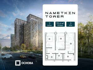 Этот лот вы можете приобрести с ПВ всего 30% в рассрочку под 0%.Продаются 3-к апартаменты площадью 70.6 кв.м. на 3-м этаже 29 этажного дома в ''NAMETKIN TOWER'' от ГК ОСНОВА.Есть возможность приобретения лотов с отделкой white box.Nametkin Tower с двухуровневым подземным паркингом и обширной инфраструктурой будет построен в районе Черемушки по адресу: ул. Намёткина, вл. 10, рядом с Битцевским лесопарком и Воронцовским парком. Архитектура от известного бюро Mecanoo из Нидерландов. Новый комплекс на Наметкина, 10 включает 4 секции переменной этажности 24-29 этажей, двухуровневый подземный паркинг. В каждой секции запроектированы лобби с мягкими рекреационными зонами, консьерж-сервисом 24/7, колясочными, комнатами для матери и ребенка и гостевыми санузлами. На 25 этаже расположится досуговая зона на открытом воздухе с выходом на тематические площадки. К услугам резидентов Nametkin Tower будет предоставлена максимально насыщенная внутренняя инфраструктура: ресторан, супермаркет, спортивный центр, зал для проведения мероприятий, теннисные и бильярдные столы, коворкинг, Sky Bar, а также собственный медицинский центр и SPA. Дополнением станет благоустройство по авторской концепции Mecanoo, разделенное на два пространства: общественное вдоль улицы Намёткина, где будут располагаться входы в ресторан и магазины, а также приватное дворовое пространство, выполненное в концепции ''''двор без машин''''. В основе проектирования всех лотов лежит принцип оптимальной эргономики пространства и большая площадь остекления с высотой оконных проемов 2,7 м.