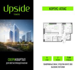 Продаётся 2-комнатная квартира площадью 73.68 кв.м на 6 этаже 47 этажного корпуса Атлас в квартале небоскребов ''Upside Towers''. В квартире отделка White-box, c видом на корпус Эльбрус, прогулочный бульвар, Савеловский сити, Гончаровский парк. Номер квартиры Б0602.Upside Towers - технологичный квартал строится в динамично развивающемся Бутырском районе, в 3 мин. от метро, в 5 мин. от ТТК. На территории 7 га возводится 5 высотных башен от 19 до 58 этажей, названных в честь главных вершин земли. Квартиры с панорамными окнами в пол, высокими потолками и современными инженерными решениями. Благоустроенная зеленая территория включает: приватные дворы, природный комплекс, прогулочный бульвар, ландшафтный парк 2,5 га с сенсорным садом и многофункциональными игровыми и спортивными площадками. В корпусе откроются магазины, кафе и рестораны, а также другие объекты коммерческой инфраструктуры. На последнем этаже корпуса предусмотрен SPA Relax центр с панорамным видом на город. Собственники квартир смогут в любое удобное для них время забронировать посещение спа-зоны через смарт-приложение. Дня них будут доступны джакузи, пространства для занятий йогой, а также места для отдыха и релаксации.Большое внимание в проекте уделяется созданию социальной инфраструктуры. Между ''Атласом'' и ''Олимпом'' в трехэтажном стилобате разместится уникальное пространство закрытый клуб для жителей квартала Upside Club площадью 2 000 кв. м. Здесь появится каминный зал с роялем, многофункциональная детская зона c двухуровневым игровым оборудованием для малышей и дошкольников, плей-рум для подростков, домашний кинотеатр, коворкинг, переговорные и лектории. На крыше стилобата разместится всесезонная BBQ патио-зона с верандой и закрытыми помещениями для приготовления и отдыха. В башнях откроются смотровые террасы для резидентов с панорамными видами на город, парки, Останкинскую башню, ВДНХ, Ботанический сад и Москва-Сити.Покупая квартиру даже самого минимального размера в Upside Towers, вы получаете в пользование 2 000 м² бесплатных общественных пространств.В рамках проекта строится государственная школа и детский сад, разместится более 15 000 кв.м. коммерческой инфраструктуры. Насыщенная социальная инфраструктура формирует множество сценариев для жизни на территории квартала. В Upside Towers применяются лучшие технологии и практики, чтобы обеспечить высшее качество жизни: Воздух, не уступающий по качеству горному, обеспечит приточно-вытяжная вентиляция. Пятиступенчатая очистка воды с сохранением полезных минералов. Центральное кондиционирование. Внутрипольные конвекторы с естественной конвекцией. Современные системы безопасности и мониторинга микроклимата. Высокоскоростной интернет на всей территории, в квартирах и паркинге за счет усиления GSM-связи всех ведущих операторов.Все места в подземном паркинге оборудованы зарядками для электрокаров.Бутырский район непрерывно развивается и готовится стать новым современным деловым районом Москвы. В рамках программы ''Индуст