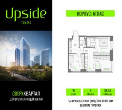 Продаётся 2-комнатная квартира площадью 58.94 кв.м на 18 этаже 47 этажного корпуса Атлас в квартале небоскребов ''Upside Towers''. В квартире отделка White-box, c видом на корпус Монте Бьянко, корпус Эверест, внутренний двор, ландшафтный парк. Номер квартиры Б1809.Upside Towers - технологичный квартал строится в динамично развивающемся Бутырском районе, в 3 мин. от метро, в 5 мин. от ТТК. На территории 7 га возводится 5 высотных башен от 19 до 58 этажей, названных в честь главных вершин земли. Квартиры с панорамными окнами в пол, высокими потолками и современными инженерными решениями. Благоустроенная зеленая территория включает: приватные дворы, природный комплекс, прогулочный бульвар, ландшафтный парк 2,5 га с сенсорным садом и многофункциональными игровыми и спортивными площадками. В корпусе откроются магазины, кафе и рестораны, а также другие объекты коммерческой инфраструктуры. На последнем этаже корпуса предусмотрен SPA Relax центр с панорамным видом на город. Собственники квартир смогут в любое удобное для них время забронировать посещение спа-зоны через смарт-приложение. Дня них будут доступны джакузи, пространства для занятий йогой, а также места для отдыха и релаксации.Большое внимание в проекте уделяется созданию социальной инфраструктуры. Между ''Атласом'' и ''Олимпом'' в трехэтажном стилобате разместится уникальное пространство закрытый клуб для жителей квартала Upside Club площадью 2 000 кв. м. Здесь появится каминный зал с роялем, многофункциональная детская зона c двухуровневым игровым оборудованием для малышей и дошкольников, плей-рум для подростков, домашний кинотеатр, коворкинг, переговорные и лектории. На крыше стилобата разместится всесезонная BBQ патио-зона с верандой и закрытыми помещениями для приготовления и отдыха. В башнях откроются смотровые террасы для резидентов с панорамными видами на город, парки, Останкинскую башню, ВДНХ, Ботанический сад и Москва-Сити.Покупая квартиру даже самого минимального размера в Upside Towers, вы получаете в пользование 2 000 м² бесплатных общественных пространств.В рамках проекта строится государственная школа и детский сад, разместится более 15 000 кв.м. коммерческой инфраструктуры. Насыщенная социальная инфраструктура формирует множество сценариев для жизни на территории квартала. В Upside Towers применяются лучшие технологии и практики, чтобы обеспечить высшее качество жизни: Воздух, не уступающий по качеству горному, обеспечит приточно-вытяжная вентиляция. Пятиступенчатая очистка воды с сохранением полезных минералов. Центральное кондиционирование. Внутрипольные конвекторы с естественной конвекцией. Современные системы безопасности и мониторинга микроклимата. Высокоскоростной интернет на всей территории, в квартирах и паркинге за счет усиления GSM-связи всех ведущих операторов.Все места в подземном паркинге оборудованы зарядками для электрокаров.Бутырский район непрерывно развивается и готовится стать новым современным деловым районом Москвы. В рамках программы ''Индустр