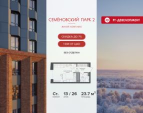 Ипотека для каждого! Полная стоимость кредита от 13,192% до 17,149%. Ставка от 0,11% в АО ''Альфа-Банк'', ген. лицензия ЦБ РФ 1326 от 16.01.2015. Ставка фиксируется на первые 12 месяцев, далее полная стоимость кредита от 22,022% до 24,599% ставка 21,59%. Первоначальный взнос — от 20,1% от стоимости квартиры. Срок кредитования — от 4 до 30 лет.Ипотека на весь срок! Полная стоимость кредита от 23,396% до 26,058% со ставкой 14,5%! Первоначальный взнос —от 20,01% от стоимости квартиры. Срок кредитования — от 3 до 30 лет. АО ''Банк ДОМ.РФ'' универсальная лицензия Банка России 2312 от 19.12.2018.Скидка 7% при покупке квартиры! Цена указана с учетом максимального размера скидки.Продается студия 23,7 кв.м. в ЖК ''Семеновский парк 2'' на 13-м этаже 26 этажного дома.Компания ''РГ-Девелопмент'' предоставляет скидку на квартиры в жилом комплексе. Акция действительна до 15.03.2026 включительно. Чтобы воспользоваться предложением, необходимо подписать договор на приобретение недвижимости до 15.03.2026 включительно.Компания ''РГ-Девелопмент'' вошла в ТОП-10 девелоперов по объёму введённого жилья в ''Старой Москве'' по итогам 2025 года.Прямая продажа от застройщика!Квартиры без отделки.Срок сдачи корпуса - 1 кв. 2026 г.ЖК ''Семеновский парк 2'' - это идеальное место для того, чтобы стать вашим домом. Проект расположен в исторической части Москвы вблизи Измайловского лесопарка, в 1 км от ЦАО. 4 станции метро отделяют вас от Красной площади и 15 минут на автомобиле - от Садового кольца.