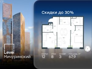 Цена указана с учётом скидки при 100%-й оплате, несубсидированной ипотеке, рассрочке (кроме программы ''Рассрочка 0%''). В жилом квартале, расположенном на границе с природным заказником ''Долина реки Очаковки'', продаётся 3-комнатная квартира площадью 67.90 кв.м без отделки. Квартира расположена на 8 этаже 11-этажного корпуса 12 в жилом комплексе бизнес-класса Level Мичуринский (компания Level Group/Левел групп). Отличная транспортная доступность: - от 10 мин. пешком до станции метро ''Мичуринский проспект''- 15 мин. пешком до станции метро ''Аминьевская''- 7 мин. на авто до МКАД- 10 мин. на авто до ТТК- 15 мин. на авто до Москва-Сити Продуманный архитектурный проект:- Выразительная архитектура от известных бюро: корпуса 1-6 - СПИЧ, корпуса 7-13 - Borisov Architects,- Из окон открываются живописные виды на парки, Москва-Сити и МГУ,- Высокие потолки до 6,35 м,- Стильные лобби с окнами в пол и высокими потолками до 4,7 м,- С каждого этажа дома на лифте можно спуститься в подземный отапливаемый паркинг.Расположение:Level Мичуринский строится в одном из самых зелёных районов Москвы - Очаково-Матвеевское. Этот уголок столицы идеален для поддержания здорового образа жизни. В шаговой доступности от проекта находятся заказник ''Долина реки Очаковки'' - 1 мин. пешком и Очаковский парк - 7 мин. пешком. На велосипеде можно добраться до таких парков, как ''Событие'', парк Олимпийской деревни, парк 50-летия Октября и парк Школьников.В 15 минутах езды на авто расположено более 30 детских садов (из них 14 в пешей доступности), 32 школы (из них 13 в пешей доступности) и 14 вузов. Также в ближайшем окружении - более 25 медицинских учреждений, 11 спортивных клубов и 22 продуктовых супермаркета.Внутренняя инфраструктура:На территории жилого комплекса строится три детских сада и школа. На первых этажах домов откроется супермаркет, фитнес-центр, ресторан, кафе и другие сервисы. Подземные этажи займут паркинги: трёхуровневые - в этапах 1 и 2, одноуровневый - в этапах 3 и 4.Преимущества проекта:- 4,5 га благоустроенной территории с видовым мостом, уличным кинотеатром, зонами для тихого отдыха, работы, воркаута, площадки для петанка, футбола, настольного тенниса и пляжного волейбола.- Дизайнерские лобби с панорамным видом на двор, мойками для лап животных и комфортными зонами ожидания.- Безопасность жителей: круглосуточное видеонаблюдение всех зон общего пользования (лобби, лифты, паркинги, детские площадки), система контроля доступа, управление видеодомофоном через мобильное приложение, единый ключ доступа на территорию жилого комплекса.- Технологии и комфорт: высокоскоростной Wi-Fi в лобби и на придомовой территории, автоматическая система контроля и учёта ресурсов, абонентская связь с консьержем, распознавание номеров автомобилей при въезде в паркинг и выезде из него.