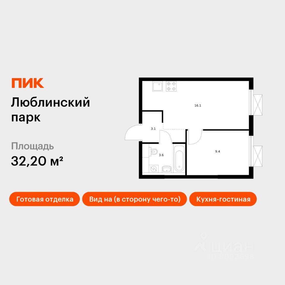 Продаётся 1-комн. квартира площадью 32,2 кв.м на 13 этаже 16 этажного дома (Корпус 12, Секция 4) проекта ПИК Люблинский парк. Светлый просторный подъезд на уровне земли, функциональная планировка, большие окна, c отделкой. Жилой квартал ''Люблинский парк'' расположен на юго-востоке Москвы, в шаговой доступности от станции ''Братиславская''. На метро до центра ехать всего 30 минут. Также недалеко станция МЦД ''Перерва'', от которой можно уехать в Москву или в область. В проекте 54 жилых корпуса, три школы, семь детских садов, поликлиника. В районе есть все условия для комфортной жизни: торговые центры, школы, детские сады, поликлиники и спортивные центры. Рядом находятся усадьба Люблино, скверы и парки. Различные магазины, кафе и другие сервисы откроются на первых этажах, а на подземных будут паркинги с удобной навигацией. В зелёных дворах без автомобилей мы построим детские площадки и места для отдыха. А ещё ''Люблинский парк'' стал третьим проектом ПИК с большой игровой площадкой PlayHub, которая уже открылась между 1-м и 2-м блоками на безопасном расстоянии от дороги. Новое детское пространство ''Остров'' воплощает идею бесконечной игры. Ландшафт площадки — это ещё и игровой элемент, который помогает детям придумывать множество самых разнообразных игр. Здесь интересно детям разного возраста — от малышей до подростков. Жителям квартала Люблинский парк и их друзьям доступен проект ПИКСПОРТ — это бесплатные занятия с профессиональными тренерами. Тренировки по разным направлениям, например йога, фитнес, бег, воркаут, проходят как в группе на улице рядом с домом, так и онлайн. Артикул 602232 (Застройщик ООО СЗ ''Люблино Девелопмент'')