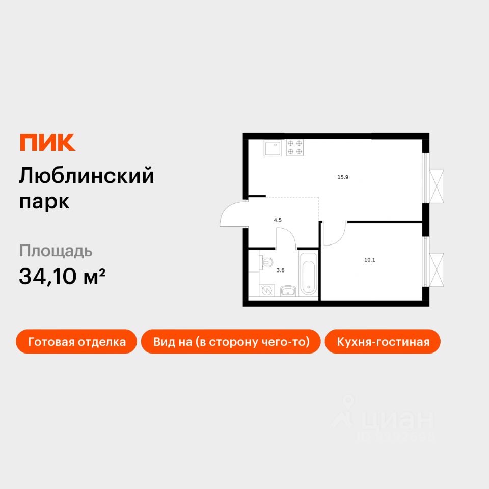 Продаётся 1-комн. квартира площадью 34,1 кв.м на 25 этаже 25 этажного дома (Корпус 12, Секция 1) проекта ПИК Люблинский парк. Светлый просторный подъезд на уровне земли, функциональная планировка, большие окна, c отделкой. Жилой квартал ''Люблинский парк'' расположен на юго-востоке Москвы, в шаговой доступности от станции ''Братиславская''. На метро до центра ехать всего 30 минут. Также недалеко станция МЦД ''Перерва'', от которой можно уехать в Москву или в область. В проекте 54 жилых корпуса, три школы, семь детских садов, поликлиника. В районе есть все условия для комфортной жизни: торговые центры, школы, детские сады, поликлиники и спортивные центры. Рядом находятся усадьба Люблино, скверы и парки. Различные магазины, кафе и другие сервисы откроются на первых этажах, а на подземных будут паркинги с удобной навигацией. В зелёных дворах без автомобилей мы построим детские площадки и места для отдыха. А ещё ''Люблинский парк'' стал третьим проектом ПИК с большой игровой площадкой PlayHub, которая уже открылась между 1-м и 2-м блоками на безопасном расстоянии от дороги. Новое детское пространство ''Остров'' воплощает идею бесконечной игры. Ландшафт площадки — это ещё и игровой элемент, который помогает детям придумывать множество самых разнообразных игр. Здесь интересно детям разного возраста — от малышей до подростков. Жителям квартала Люблинский парк и их друзьям доступен проект ПИКСПОРТ — это бесплатные занятия с профессиональными тренерами. Тренировки по разным направлениям, например йога, фитнес, бег, воркаут, проходят как в группе на улице рядом с домом, так и онлайн. Артикул 659554 (Застройщик ООО СЗ ''Люблино Девелопмент'')
