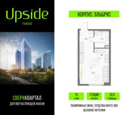Продаётся студия площадью 32.9 кв.м на 31 этаже 55 этажного корпуса Эльбрус в квартале небоскребов ''Апсайд Тауэрс'', в квартире предчистовая отделка, c видом на 2 очередь, прогулочный бульвар, парк Сокольники. Номер квартиры А3109.Апсайд Тауэрс - технологичный квартал строится в динамично развивающемся Бутырском районе, в 3 мин. от метро, в 5 мин. от ТТК. На территории 7 га возводится 5 высотных башен от 19 до 58 этажей, названных в честь главных вершин земли. Квартиры с панорамными окнами в пол, высокими потолками и современными инженерными решениями. Благоустроенная зеленая территория включает: приватные дворы, природный комплекс, прогулочный бульвар, ландшафтный парк 2,5 га с сенсорным садом и многофункциональными игровыми и спортивными площадками. Большое внимание в проекте уделяется созданию социальной инфраструктуры. Более 2000 кв.м. отдано под Апсайд Клуб закрытый клуб, уникальное пространство для общения и развития жителей квартала, включая расслабляющую атмосферу, джакузи, сауну, залы для релаксации и йоги доступное жителям Апсайд Тауэрс, всесезонное барбекю-патио, лаундж зону с камином и роялем, многофункциональные игровые пространства, домашний кинотеатр, коворкинг и переговорные. В башнях откроются смотровые террасы для резидентов с панорамными видами на город, парки, Останкинскую башню, ВДНХ, Ботанический сад и Москву-Сити. В рамках проекта строится государственная школа и детский сад, разместится более 15 000 кв.м. коммерческой инфраструктуры. Насыщенная социальная инфраструктура формирует множество сценариев для жизни на территории квартала. В Апсайд Тауэрс применяются лучшие технологии и практики, чтобы обеспечить высшее качество жизни: Воздух, не уступающий по качеству горному, обеспечит приточно-вытяжная вентиляция. Пятиступенчатая очистка воды с сохранением полезных минералов. Центральное кондиционирование. Внутрипольные конвекторы с естественной конвекцией. Современные системы безопасности и мониторинга микроклимата. Высокоскоростной интернет на всей территории, в квартирах и паркинге.Все места в подземном паркинге оборудованы зарядками для электрокаров.Бутырский район непрерывно развивается и готовится стать новым современным деловым районом Москвы. В рамках программы ''Индустриальные кварталы'' комплексного развития территории Огородного проезда будут построены современные образовательные и спортивные учреждения, торговые центры, кафе, банки, общественно-деловые здания и другие объекты.В пешей доступности работают школы, детские сады, поликлиники, аптеки, супермаркеты и многое другое. Рядом находится несколько крупных зелёных зон для спокойного отдыха: Парк Останкино, ВДНХ, Парк Сокольники, Гончаровский парк. Время в пути на автомобиле до центра Москвы 15 минут. (Застройщик ООО ''СЗ ''К-Девелопмент'')
