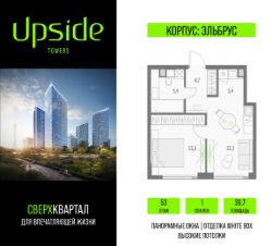 Продаётся 1-комнатная квартира площадью 39.7 кв.м на 53 этаже 55 этажного корпуса Эльбрус в квартале небоскребов ''Апсайд Тауэрс'', в квартире предчистовая отделка, c видом на 2 очередь, прогулочный бульвар, парк Сокольники. Номер квартиры А5313.Апсайд Тауэрс - технологичный квартал строится в динамично развивающемся Бутырском районе, в 3 мин. от метро, в 5 мин. от ТТК. На территории 7 га возводится 5 высотных башен от 19 до 58 этажей, названных в честь главных вершин земли. Квартиры с панорамными окнами в пол, высокими потолками и современными инженерными решениями. Благоустроенная зеленая территория включает: приватные дворы, природный комплекс, прогулочный бульвар, ландшафтный парк 2,5 га с сенсорным садом и многофункциональными игровыми и спортивными площадками. Большое внимание в проекте уделяется созданию социальной инфраструктуры. Более 2000 кв.м. отдано под Апсайд Клуб закрытый клуб, уникальное пространство для общения и развития жителей квартала, включая расслабляющую атмосферу, джакузи, сауну, залы для релаксации и йоги доступное жителям Апсайд Тауэрс, всесезонное барбекю-патио, лаундж зону с камином и роялем, многофункциональные игровые пространства, домашний кинотеатр, коворкинг и переговорные. В башнях откроются смотровые террасы для резидентов с панорамными видами на город, парки, Останкинскую башню, ВДНХ, Ботанический сад и Москву-Сити. В рамках проекта строится государственная школа и детский сад, разместится более 15 000 кв.м. коммерческой инфраструктуры. Насыщенная социальная инфраструктура формирует множество сценариев для жизни на территории квартала. В Апсайд Тауэрс применяются лучшие технологии и практики, чтобы обеспечить высшее качество жизни: Воздух, не уступающий по качеству горному, обеспечит приточно-вытяжная вентиляция. Пятиступенчатая очистка воды с сохранением полезных минералов. Центральное кондиционирование. Внутрипольные конвекторы с естественной конвекцией. Современные системы безопасности и мониторинга микроклимата. Высокоскоростной интернет на всей территории, в квартирах и паркинге.Все места в подземном паркинге оборудованы зарядками для электрокаров.Бутырский район непрерывно развивается и готовится стать новым современным деловым районом Москвы. В рамках программы ''Индустриальные кварталы'' комплексного развития территории Огородного проезда будут построены современные образовательные и спортивные учреждения, торговые центры, кафе, банки, общественно-деловые здания и другие объекты.В пешей доступности работают школы, детские сады, поликлиники, аптеки, супермаркеты и многое другое. Рядом находится несколько крупных зелёных зон для спокойного отдыха: Парк Останкино, ВДНХ, Парк Сокольники, Гончаровский парк. Время в пути на автомобиле до центра Москвы 15 минут. (Застройщик ООО ''СЗ ''К-Девелопмент'')