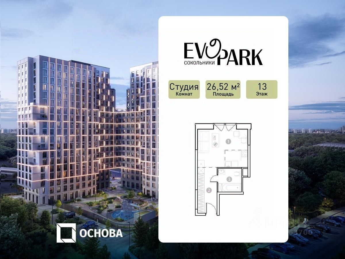 Продается студия площадью 28.56 кв.м. на 10-м этаже 20 этажного дома в EVOPARK Сокольники от ГК ОСНОВА.''EVOPARK Сокольники'' расположен в историческом районе Преображенское, в 300 метрах от парка Сокольники. ''EVOPARK Сокольники'' расположен на набережной реки Яуза и находится в 15 минутах пешком от м. ''Преображенская площадь''. Быстрый выезд на главные транспортные магистрали (ТТК и ул. Стромынка) позволит добраться на личном авто до центра Москвы за полчаса. ''EVOPARK Сокольники'' - это два корпуса переменной этажности (максимально 20 этажей) с апартаментами бизнес-класса и подземным паркингом. В проект благоустройства входит двор с ландшафтным дизайном, который предусматривает зоны тихого отдыха, лестницу с амфитеатром, детские площадки и игровые площадки для детей разных возрастов, зеленые зоны отдыха. Для самых активных здесь оборудована work-out площадка. Два корпуса соединены между собой аркой с видом на парк Сокольники. На уровне 13-18 этажей располагаются видовые террасы с ограждениями из безопасного стекла, где можно насладиться шикарными видами на парк Сокольники и самыми красивыми закатами.