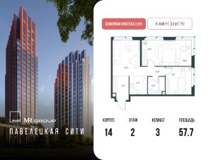 Цена указана с учётом скидки при 100%-й оплате, несубсидированной ипотеке, рассрочке (кроме программы ''Рассрочка 0%''). В Даниловском районе столицы (ЮАО) продаётся 3-комнатная квартира площадью 57.70 кв.м без отделки. Квартира расположена на 2 этаже 27-этажного корпуса 'Горизонт' в жилом комплексе бизнес-класса Level Павелецкая Сити. Высота потолков 3.00м. Престижная локация ''Level Павелецкая Сити'' - это жилой комплекс бизнес-класса, расположенный в престижном Даниловском районе Москвы - историческом центре города в окружении парков, Москвы-реки и новейшей инфраструктуры. В 20 минутах пешком есть 3 станции метро, а в 5 минутах езды на авто - ТТК и Садовое кольцо. - 15 мин. пешком до метро ''Павелецкая'', - 20 мин. пешком до станций ''Тульская'' и ''Серпуховская'', - 8 мин. на авто до Кремля, - 10 мин. на авто до парка Горького и парка ''Зарядье'', - 20 мин. на авто до башен ''Москва-Сити''. Авторская архитектура Авторская архитектурная концепция разработана бюро СПИЧ. Облик корпусов I и II очередей отсылает к стилистике архитектуры классического Нью-Йорка и золотой эпохи Голливуда. Корпуса IV очереди вдохновлены эстетикой ар-деко. Умное линейное расположение корпусов гарантирует потрясающие виды на исторический центр и Москву-реку из большинства квартир. Дизайнерские лобби Изысканные интерьеры лобби жилого комплекса отсылают к классическим фильмам золотой эпохи Голливуда. Классика в ''Level Павелецкая Сити'' - не имитация, а современное осмысление лучшего в этом стиле. В каждом вестибюле оборудованы стойки ресепшен, комфортные зоны ожидания, гостевые санузлы, мойки для лап животных, колясочные. В корпусах по 3-4 лифта с прямым доступом в паркинг. Площадь лобби - от 47,9 до 114,9 кв. м, высота потолков - до 5,46 м. Благоустройство и инфраструктура Для создания благоустройства было приглашено 2 ведущих бюро - ADM и GAFA. Разноуровневое пространство вмещает в себя игровые площадки для детей всех возрастов, тропы здоровья для пеших прогулок, крытые аллеи с качелями, места для работы на свежем воздухе, многофункциональные спортивные площадки - воркаут-зоны, столы для пинг-понга, зоны командных игр. Общая площадь закрытого двора - 4,63 га. Комфорт - это когда рядом всё, что нужно для жизни. На первых этажах и в стилобатной части корпусов ''Level Павелецкая Сити'' размещены 85 коммерческих помещений, где откроются супермаркеты, кафе, аптеки и многое другое. В составе проекта также предусмотрены собственный фитнес-клуб, развивающий центр Letovo Kids, школа на 720 мест и детский сад на 175 мест. Технологии и безопасность - Wi-Fi в лобби и на придомовой территории, - Автоматизированная система контроля и учета ресурсов, - Круглосуточное видеонаблюдение и охрана, - Круглосуточная связь с охраной через приложение, телефон или кол-центр, - Контроль доступа по биометрической системе Face-ID, - Усиленный сотовый сигнал в лифтах и паркинге, - Распознавание номеров автомобилей при въезде/выезде в/из паркинга.