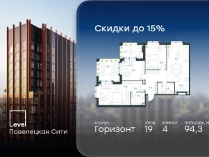 Цена указана с учётом скидки при 100%-й оплате, несубсидированной ипотеке, рассрочке (кроме программы ''Рассрочка 0%'').В Даниловском районе столицы (ЮАО) продаётся 4-комнатная квартира площадью 87.70 кв.м без отделки. Квартира расположена на 14 этаже 27-этажного корпуса 'Горизонт' в жилом комплексе бизнес-класса Level Павелецкая Сити. Высота потолков 3.00м. Престижная локация''Level Павелецкая Сити'' - это жилой комплекс бизнес-класса, расположенный в престижном Даниловском районе Москвы - историческом центре города в окружении парков, Москвы-реки и новейшей инфраструктуры. В 20 минутах пешком есть 3 станции метро, а в 5 минутах езды на авто - ТТК и Садовое кольцо.- 15 мин. пешком до метро ''Павелецкая'',- 20 мин. пешком до станций ''Тульская'' и ''Серпуховская'',- 8 мин. на авто до Кремля,- 10 мин. на авто до парка Горького и парка ''Зарядье'',- 20 мин. на авто до башен ''Москва-Сити''.Авторская архитектураАвторская архитектурная концепция разработана бюро СПИЧ. Облик корпусов I и II очередей отсылает к стилистике архитектуры классического Нью-Йорка и золотой эпохи Голливуда. Корпуса IV очереди вдохновлены эстетикой ар-деко. Умное линейное расположение корпусов гарантирует потрясающие виды на исторический центр и Москву-реку из большинства квартир. Дизайнерские лоббиИзысканные интерьеры лобби жилого комплекса отсылают к классическим фильмам золотой эпохи Голливуда. Классика в ''Level Павелецкая Сити'' - не имитация, а современное осмысление лучшего в этом стиле.В каждом вестибюле оборудованы стойки ресепшен, комфортные зоны ожидания, гостевые санузлы, мойки для лап животных, колясочные. В корпусах по 3-4 лифта с прямым доступом в паркинг. Площадь лобби - от 47,9 до 114,9 кв. м, высота потолков - до 5,46 м.Благоустройство и инфраструктураДля создания благоустройства было приглашено 2 ведущих бюро - ADM и GAFA. Разноуровневое пространство вмещает в себя игровые площадки для детей всех возрастов, тропы здоровья для пеших прогулок, крытые аллеи с качелями, места для работы на свежем воздухе, многофункциональные спортивные площадки - воркаут-зоны, столы для пинг-понга, зоны командных игр. Общая площадь закрытого двора - 4,63 га.Комфорт - это когда рядом всё, что нужно для жизни. На первых этажах и в стилобатной части корпусов ''Level Павелецкая Сити'' размещены 85 коммерческих помещений, где откроются супермаркеты, кафе, аптеки и многое другое. В составе проекта также предусмотрены собственный фитнес-клуб, развивающий центр Letovo Kids, школа на 720 мест и детский сад на 175 мест.Технологии и безопасность- Wi-Fi в лобби и на придомовой территории,- Автоматизированная система контроля и учета ресурсов,- Круглосуточное видеонаблюдение и охрана,- Круглосуточная связь с охраной через приложение, телефон или кол-центр,- Контроль доступа по биометрической системе Face-ID,- Усиленный сотовый сигнал в лифтах и паркинге,- Распознавание номеров автомобилей при въезде/выезде в/из паркинга.