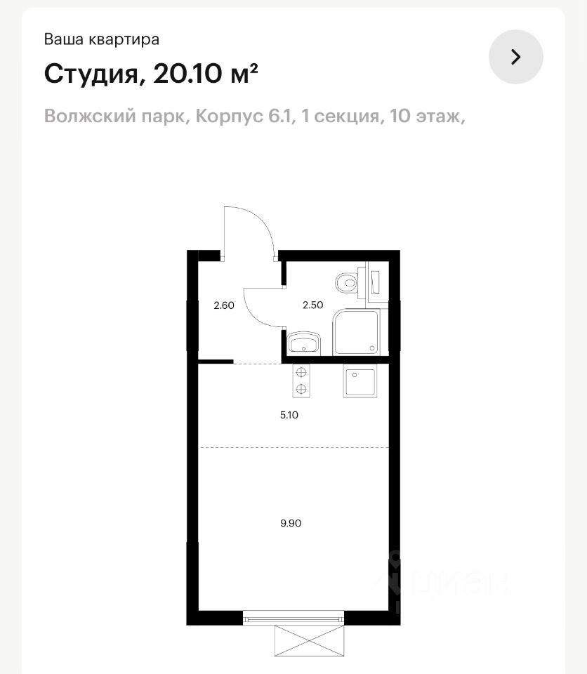 Продаю по переуступке прав квартиру-студию в ЖК Волжский парк с ремонтом от застройщика, корпус 6.1, секция 1, этаж 10 (подробнее на схемах этажа отмечено местоположение квартиры). 31.12.2025 получено разрешение на ввод в эксплуатацию дома. Получение ключей и заселение максимально по ДДУ до 30 апреля 2026г. Площадь общая 20,10 кв.м: комната 9,90 кв.м, остальные помещения 10,20 кв.м. (Холл 2,60 кв.м, санузел 2,50 кв.м, кухня-ниша 5,10 кв.м). Дом находится в тихой части района, окна не на хорду мсд, под окнами нет дорог с активным автомобильным движением, рядом располагаются наземные паркинги 1 взрослый собственник, квартира приобретена за наличные (без ипотеки, без обременений) Отличная транспортная доступность (м.Текстильщики пешком 15-20 минут, мцк и мцд-2 Новохохловская, мсд, до центра 15 минут на машине, рядом 2 автобусные остановки). Благоустроенный двор, развитая инфраструктура (детский сад работает и школа (достраиваетс) во дворе у дома под окнами), поликлиники, магазины, ТЦ Город, Ашан, Леруа Мерлен, кинотеатры Молодежный и Олимпик Синема, творческий и спортивный комплекс Москвич с бассейном, ледовым катком и школой олимпийского резерва. Рядом расположены Люблинский и Кузьминский парки, пруд Садки, музей-усадьба Кусково агентам просьба не беспокоить