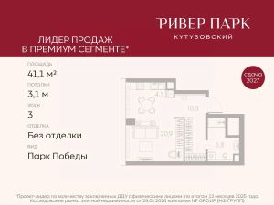 Продается студия площадью 41.1 кв.м. на 3-м этаже в жилом комплексе премиум-класса Ривер Парк Кутузовский в Башне ЛазурьПремиальный жилой комплекс Ривер Парк Кутузовский строится в одном из самых престижных районов столицы Дорогомилово, на берегу Москвы-реки с лучшими видами на Москва-Сити. Яркий проект в стиле эко-футуризма станет самым масштабным и самым высотным ЖК в локации Кутузовского проспекта. Расположение и Транспортная доступность:• На берегу Москвы-реки, напротив Москва-Сити• 600 метров до Кутузовского проспекта• Удобный съезд с ТТК• Прямой выезд на МКАД по Проспекту Багратиона.• В пешей доступности 3 станции метро: Фили, Парк Победы, Кутузовская, а также станция МЦД Фили.Архитектура от именитого бюро ADM отличается уникальной пластикой фасадов - башни словно парят в воздухе, играя гранями как драгоценные камни. Жилой комплекс состоит из 5-ти небоскребов с приватным парком 2 Га и внешней торговой галереей с открытым доступом.В закрытом внутреннем дворе уникальная по насыщенности клубная инфраструктура только для жителей:• Площадка Мультиспорт (баскетбол, футбол, воллейбол, большой теннис)• Детский игровой клуб Немо • Музыкальная студия• Клуб Гедонист с бильярдной• Студия стиля для стилистов и массажа• Гольф-симулятор• КараокеВпервые в Москве лаунж-зоны на крыше небоскребов, только для жителей:• Всесезонные беседки иглу• Джакузи• Гриль• Площадка для занятий йогой• Самые высоки качели на крыше в России• Видовые площадкиБлагоустройство комплекса занимает 3 гектара и разработано мировым экспертом по городским парковым ландшафтам - голландским бюро WEST8. Концепция проекта дать жителям отдохнуть от городского ритма и расслабиться среди природы. В Приватном парке уже высажены хвойные деревья-крупномеры сосны и ели. • Зеркальный пруд с арт-объектом• Две детские площадки• Точка спорта с тренажерами и турниками• Цветущий сад• Зеленый театр со сценой и проектором• Видовая зона отдыха с очагом• Солнечная терраса с лежакамиНа территории жилого комплекса планируется строительство коммерческого образовательного центра, включающего детский сад на 200 мест и школу на 460 мест.