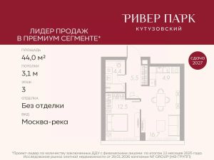 Продается 1-к квартира площадью 44.0 кв.м. на 3-м этаже в жилом комплексе премиум-класса Ривер Парк Кутузовский в Башне ЛазурьПремиальный жилой комплекс Ривер Парк Кутузовский строится в одном из самых престижных районов столицы Дорогомилово, на берегу Москвы-реки с лучшими видами на Москва-Сити. Яркий проект в стиле эко-футуризма станет самым масштабным и самым высотным ЖК в локации Кутузовского проспекта. Расположение и Транспортная доступность:• На берегу Москвы-реки, напротив Москва-Сити• 600 метров до Кутузовского проспекта• Удобный съезд с ТТК• Прямой выезд на МКАД по Проспекту Багратиона.• В пешей доступности 3 станции метро: Фили, Парк Победы, Кутузовская, а также станция МЦД Фили.Архитектура от именитого бюро ADM отличается уникальной пластикой фасадов - башни словно парят в воздухе, играя гранями как драгоценные камни. Жилой комплекс состоит из 5-ти небоскребов с приватным парком 2 Га и внешней торговой галереей с открытым доступом.В закрытом внутреннем дворе уникальная по насыщенности клубная инфраструктура только для жителей:• Площадка Мультиспорт (баскетбол, футбол, воллейбол, большой теннис)• Детский игровой клуб Немо • Музыкальная студия• Клуб Гедонист с бильярдной• Студия стиля для стилистов и массажа• Гольф-симулятор• КараокеВпервые в Москве лаунж-зоны на крыше небоскребов, только для жителей:• Всесезонные беседки иглу• Джакузи• Гриль• Площадка для занятий йогой• Самые высоки качели на крыше в России• Видовые площадкиБлагоустройство комплекса занимает 3 гектара и разработано мировым экспертом по городским парковым ландшафтам - голландским бюро WEST8. Концепция проекта дать жителям отдохнуть от городского ритма и расслабиться среди природы. В Приватном парке уже высажены хвойные деревья-крупномеры сосны и ели. • Зеркальный пруд с арт-объектом• Две детские площадки• Точка спорта с тренажерами и турниками• Цветущий сад• Зеленый театр со сценой и проектором• Видовая зона отдыха с очагом• Солнечная терраса с лежакамиНа территории жилого комплекса планируется строительство коммерческого образовательного центра, включающего детский сад на 200 мест и школу на 460 мест.