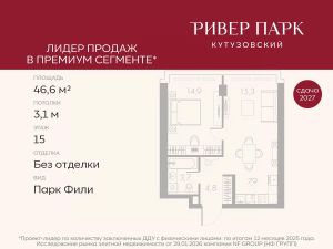 Продается 1-к квартира площадью 46.6 кв.м. на 15-м этаже в жилом комплексе премиум-класса Ривер Парк Кутузовский в Башне ЛазурьПремиальный жилой комплекс Ривер Парк Кутузовский строится в одном из самых престижных районов столицы Дорогомилово, на берегу Москвы-реки с лучшими видами на Москва-Сити. Яркий проект в стиле эко-футуризма станет самым масштабным и самым высотным ЖК в локации Кутузовского проспекта. Расположение и Транспортная доступность:• На берегу Москвы-реки, напротив Москва-Сити• 600 метров до Кутузовского проспекта• Удобный съезд с ТТК• Прямой выезд на МКАД по Проспекту Багратиона.• В пешей доступности 3 станции метро: Фили, Парк Победы, Кутузовская, а также станция МЦД Фили.Архитектура от именитого бюро ADM отличается уникальной пластикой фасадов - башни словно парят в воздухе, играя гранями как драгоценные камни. Жилой комплекс состоит из 5-ти небоскребов с приватным парком 2 Га и внешней торговой галереей с открытым доступом.В закрытом внутреннем дворе уникальная по насыщенности клубная инфраструктура только для жителей:• Площадка Мультиспорт (баскетбол, футбол, воллейбол, большой теннис)• Детский игровой клуб Немо • Музыкальная студия• Клуб Гедонист с бильярдной• Студия стиля для стилистов и массажа• Гольф-симулятор• КараокеВпервые в Москве лаунж-зоны на крыше небоскребов, только для жителей:• Всесезонные беседки иглу• Джакузи• Гриль• Площадка для занятий йогой• Самые высоки качели на крыше в России• Видовые площадкиБлагоустройство комплекса занимает 3 гектара и разработано мировым экспертом по городским парковым ландшафтам - голландским бюро WEST8. Концепция проекта дать жителям отдохнуть от городского ритма и расслабиться среди природы. В Приватном парке уже высажены хвойные деревья-крупномеры сосны и ели. • Зеркальный пруд с арт-объектом• Две детские площадки• Точка спорта с тренажерами и турниками• Цветущий сад• Зеленый театр со сценой и проектором• Видовая зона отдыха с очагом• Солнечная терраса с лежакамиНа территории жилого комплекса планируется строительство коммерческого образовательного центра, включающего детский сад на 200 мест и школу на 460 мест.