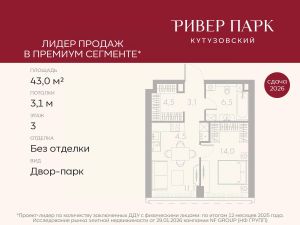 Продается 1-к квартира площадью 43.0 кв.м. на 3-м этаже в жилом комплексе премиум-класса Ривер Парк Кутузовский в Башне ЯнтарьПремиальный жилой комплекс Ривер Парк Кутузовский строится в одном из самых престижных районов столицы Дорогомилово, на берегу Москвы-реки с лучшими видами на Москва-Сити. Яркий проект в стиле эко-футуризма станет самым масштабным и самым высотным ЖК в локации Кутузовского проспекта. Расположение и Транспортная доступность:• На берегу Москвы-реки, напротив Москва-Сити• 600 метров до Кутузовского проспекта• Удобный съезд с ТТК• Прямой выезд на МКАД по Проспекту Багратиона.• В пешей доступности 3 станции метро: Фили, Парк Победы, Кутузовская, а также станция МЦД Фили.Архитектура от именитого бюро ADM отличается уникальной пластикой фасадов - башни словно парят в воздухе, играя гранями как драгоценные камни. Жилой комплекс состоит из 5-ти небоскребов с приватным парком 2 Га и внешней торговой галереей с открытым доступом.В закрытом внутреннем дворе уникальная по насыщенности клубная инфраструктура только для жителей:• Площадка Мультиспорт (баскетбол, футбол, воллейбол, большой теннис)• Детский игровой клуб Немо • Музыкальная студия• Клуб Гедонист с бильярдной• Студия стиля для стилистов и массажа• Гольф-симулятор• КараокеВпервые в Москве лаунж-зоны на крыше небоскребов, только для жителей:• Всесезонные беседки иглу• Джакузи• Гриль• Площадка для занятий йогой• Самые высоки качели на крыше в России• Видовые площадкиБлагоустройство комплекса занимает 3 гектара и разработано мировым экспертом по городским парковым ландшафтам - голландским бюро WEST8. Концепция проекта дать жителям отдохнуть от городского ритма и расслабиться среди природы. В Приватном парке уже высажены хвойные деревья-крупномеры сосны и ели. • Зеркальный пруд с арт-объектом• Две детские площадки• Точка спорта с тренажерами и турниками• Цветущий сад• Зеленый театр со сценой и проектором• Видовая зона отдыха с очагом• Солнечная терраса с лежакамиНа территории жилого комплекса планируется строительство коммерческого образовательного центра, включающего детский сад на 200 мест и школу на 460 мест.