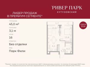 Продается 1-к квартира площадью 45.0 кв.м. на 16-м этаже в жилом комплексе премиум-класса Ривер Парк Кутузовский в Башне ЯнтарьПремиальный жилой комплекс Ривер Парк Кутузовский строится в одном из самых престижных районов столицы Дорогомилово, на берегу Москвы-реки с лучшими видами на Москва-Сити. Яркий проект в стиле эко-футуризма станет самым масштабным и самым высотным ЖК в локации Кутузовского проспекта. Расположение и Транспортная доступность:• На берегу Москвы-реки, напротив Москва-Сити• 600 метров до Кутузовского проспекта• Удобный съезд с ТТК• Прямой выезд на МКАД по Проспекту Багратиона.• В пешей доступности 3 станции метро: Фили, Парк Победы, Кутузовская, а также станция МЦД Фили.Архитектура от именитого бюро ADM отличается уникальной пластикой фасадов - башни словно парят в воздухе, играя гранями как драгоценные камни. Жилой комплекс состоит из 5-ти небоскребов с приватным парком 2 Га и внешней торговой галереей с открытым доступом.В закрытом внутреннем дворе уникальная по насыщенности клубная инфраструктура только для жителей:• Площадка Мультиспорт (баскетбол, футбол, воллейбол, большой теннис)• Детский игровой клуб Немо • Музыкальная студия• Клуб Гедонист с бильярдной• Студия стиля для стилистов и массажа• Гольф-симулятор• КараокеВпервые в Москве лаунж-зоны на крыше небоскребов, только для жителей:• Всесезонные беседки иглу• Джакузи• Гриль• Площадка для занятий йогой• Самые высоки качели на крыше в России• Видовые площадкиБлагоустройство комплекса занимает 3 гектара и разработано мировым экспертом по городским парковым ландшафтам - голландским бюро WEST8. Концепция проекта дать жителям отдохнуть от городского ритма и расслабиться среди природы. В Приватном парке уже высажены хвойные деревья-крупномеры сосны и ели. • Зеркальный пруд с арт-объектом• Две детские площадки• Точка спорта с тренажерами и турниками• Цветущий сад• Зеленый театр со сценой и проектором• Видовая зона отдыха с очагом• Солнечная терраса с лежакамиНа территории жилого комплекса планируется строительство коммерческого образовательного центра, включающего детский сад на 200 мест и школу на 460 мест.