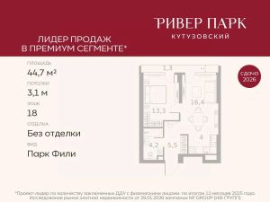 Продается 1-к квартира площадью 44.7 кв.м. на 18-м этаже в жилом комплексе премиум-класса Ривер Парк Кутузовский в Башне ЯнтарьПремиальный жилой комплекс Ривер Парк Кутузовский строится в одном из самых престижных районов столицы Дорогомилово, на берегу Москвы-реки с лучшими видами на Москва-Сити. Яркий проект в стиле эко-футуризма станет самым масштабным и самым высотным ЖК в локации Кутузовского проспекта. Расположение и Транспортная доступность:• На берегу Москвы-реки, напротив Москва-Сити• 600 метров до Кутузовского проспекта• Удобный съезд с ТТК• Прямой выезд на МКАД по Проспекту Багратиона.• В пешей доступности 3 станции метро: Фили, Парк Победы, Кутузовская, а также станция МЦД Фили.Архитектура от именитого бюро ADM отличается уникальной пластикой фасадов - башни словно парят в воздухе, играя гранями как драгоценные камни. Жилой комплекс состоит из 5-ти небоскребов с приватным парком 2 Га и внешней торговой галереей с открытым доступом.В закрытом внутреннем дворе уникальная по насыщенности клубная инфраструктура только для жителей:• Площадка Мультиспорт (баскетбол, футбол, воллейбол, большой теннис)• Детский игровой клуб Немо • Музыкальная студия• Клуб Гедонист с бильярдной• Студия стиля для стилистов и массажа• Гольф-симулятор• КараокеВпервые в Москве лаунж-зоны на крыше небоскребов, только для жителей:• Всесезонные беседки иглу• Джакузи• Гриль• Площадка для занятий йогой• Самые высоки качели на крыше в России• Видовые площадкиБлагоустройство комплекса занимает 3 гектара и разработано мировым экспертом по городским парковым ландшафтам - голландским бюро WEST8. Концепция проекта дать жителям отдохнуть от городского ритма и расслабиться среди природы. В Приватном парке уже высажены хвойные деревья-крупномеры сосны и ели. • Зеркальный пруд с арт-объектом• Две детские площадки• Точка спорта с тренажерами и турниками• Цветущий сад• Зеленый театр со сценой и проектором• Видовая зона отдыха с очагом• Солнечная терраса с лежакамиНа территории жилого комплекса планируется строительство коммерческого образовательного центра, включающего детский сад на 200 мест и школу на 460 мест.