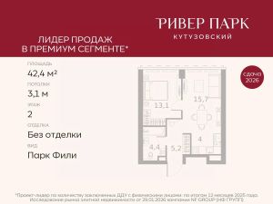 Продается 1-к квартира площадью 42.4 кв.м. на 2-м этаже в жилом комплексе премиум-класса Ривер Парк Кутузовский в Башне ЯнтарьПремиальный жилой комплекс Ривер Парк Кутузовский строится в одном из самых престижных районов столицы Дорогомилово, на берегу Москвы-реки с лучшими видами на Москва-Сити. Яркий проект в стиле эко-футуризма станет самым масштабным и самым высотным ЖК в локации Кутузовского проспекта. Расположение и Транспортная доступность:• На берегу Москвы-реки, напротив Москва-Сити• 600 метров до Кутузовского проспекта• Удобный съезд с ТТК• Прямой выезд на МКАД по Проспекту Багратиона.• В пешей доступности 3 станции метро: Фили, Парк Победы, Кутузовская, а также станция МЦД Фили.Архитектура от именитого бюро ADM отличается уникальной пластикой фасадов - башни словно парят в воздухе, играя гранями как драгоценные камни. Жилой комплекс состоит из 5-ти небоскребов с приватным парком 2 Га и внешней торговой галереей с открытым доступом.В закрытом внутреннем дворе уникальная по насыщенности клубная инфраструктура только для жителей:• Площадка Мультиспорт (баскетбол, футбол, воллейбол, большой теннис)• Детский игровой клуб Немо • Музыкальная студия• Клуб Гедонист с бильярдной• Студия стиля для стилистов и массажа• Гольф-симулятор• КараокеВпервые в Москве лаунж-зоны на крыше небоскребов, только для жителей:• Всесезонные беседки иглу• Джакузи• Гриль• Площадка для занятий йогой• Самые высоки качели на крыше в России• Видовые площадкиБлагоустройство комплекса занимает 3 гектара и разработано мировым экспертом по городским парковым ландшафтам - голландским бюро WEST8. Концепция проекта дать жителям отдохнуть от городского ритма и расслабиться среди природы. В Приватном парке уже высажены хвойные деревья-крупномеры сосны и ели. • Зеркальный пруд с арт-объектом• Две детские площадки• Точка спорта с тренажерами и турниками• Цветущий сад• Зеленый театр со сценой и проектором• Видовая зона отдыха с очагом• Солнечная терраса с лежакамиНа территории жилого комплекса планируется строительство коммерческого образовательного центра, включающего детский сад на 200 мест и школу на 460 мест.