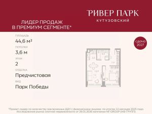 Продается 1-к квартира площадью 44.6 кв.м. на 2-м этаже в жилом комплексе премиум-класса Ривер Парк Кутузовский в Башне Бриллиант Премиальный жилой комплекс Ривер Парк Кутузовский строится в одном из самых престижных районов столицы Дорогомилово, на берегу Москвы-реки с лучшими видами на Москва-Сити. Яркий проект в стиле эко-футуризма станет самым масштабным и самым высотным ЖК в локации Кутузовского проспекта. Расположение и Транспортная доступность:• На берегу Москвы-реки, напротив Москва-Сити• 600 метров до Кутузовского проспекта• Удобный съезд с ТТК• Прямой выезд на МКАД по Проспекту Багратиона.• В пешей доступности 3 станции метро: Фили, Парк Победы, Кутузовская, а также станция МЦД Фили.Архитектура от именитого бюро ADM отличается уникальной пластикой фасадов - башни словно парят в воздухе, играя гранями как драгоценные камни. Жилой комплекс состоит из 5-ти небоскребов с приватным парком 2 Га и внешней торговой галереей с открытым доступом.В закрытом внутреннем дворе уникальная по насыщенности клубная инфраструктура только для жителей:• Площадка Мультиспорт (баскетбол, футбол, воллейбол, большой теннис)• Детский игровой клуб Немо • Музыкальная студия• Клуб Гедонист с бильярдной• Студия стиля для стилистов и массажа• Гольф-симулятор• КараокеВпервые в Москве лаунж-зоны на крыше небоскребов, только для жителей:• Всесезонные беседки иглу• Джакузи• Гриль• Площадка для занятий йогой• Самые высоки качели на крыше в России• Видовые площадкиБлагоустройство комплекса занимает 3 гектара и разработано мировым экспертом по городским парковым ландшафтам - голландским бюро WEST8. Концепция проекта дать жителям отдохнуть от городского ритма и расслабиться среди природы. В Приватном парке уже высажены хвойные деревья-крупномеры сосны и ели. • Зеркальный пруд с арт-объектом• Две детские площадки• Точка спорта с тренажерами и турниками• Цветущий сад• Зеленый театр со сценой и проектором• Видовая зона отдыха с очагом• Солнечная терраса с лежакамиНа территории жилого комплекса планируется строительство коммерческого образовательного центра, включающего детский сад на 200 мест и школу на 460 мест.