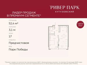 Продается 1-к квартира площадью 52.4 кв.м. на 17-м этаже в жилом комплексе премиум-класса Ривер Парк Кутузовский в Башне Бриллиант Премиальный жилой комплекс Ривер Парк Кутузовский строится в одном из самых престижных районов столицы Дорогомилово, на берегу Москвы-реки с лучшими видами на Москва-Сити. Яркий проект в стиле эко-футуризма станет самым масштабным и самым высотным ЖК в локации Кутузовского проспекта. Расположение и Транспортная доступность:• На берегу Москвы-реки, напротив Москва-Сити• 600 метров до Кутузовского проспекта• Удобный съезд с ТТК• Прямой выезд на МКАД по Проспекту Багратиона.• В пешей доступности 3 станции метро: Фили, Парк Победы, Кутузовская, а также станция МЦД Фили.Архитектура от именитого бюро ADM отличается уникальной пластикой фасадов - башни словно парят в воздухе, играя гранями как драгоценные камни. Жилой комплекс состоит из 5-ти небоскребов с приватным парком 2 Га и внешней торговой галереей с открытым доступом.В закрытом внутреннем дворе уникальная по насыщенности клубная инфраструктура только для жителей:• Площадка Мультиспорт (баскетбол, футбол, воллейбол, большой теннис)• Детский игровой клуб Немо • Музыкальная студия• Клуб Гедонист с бильярдной• Студия стиля для стилистов и массажа• Гольф-симулятор• КараокеВпервые в Москве лаунж-зоны на крыше небоскребов, только для жителей:• Всесезонные беседки иглу• Джакузи• Гриль• Площадка для занятий йогой• Самые высоки качели на крыше в России• Видовые площадкиБлагоустройство комплекса занимает 3 гектара и разработано мировым экспертом по городским парковым ландшафтам - голландским бюро WEST8. Концепция проекта дать жителям отдохнуть от городского ритма и расслабиться среди природы. В Приватном парке уже высажены хвойные деревья-крупномеры сосны и ели. • Зеркальный пруд с арт-объектом• Две детские площадки• Точка спорта с тренажерами и турниками• Цветущий сад• Зеленый театр со сценой и проектором• Видовая зона отдыха с очагом• Солнечная терраса с лежакамиНа территории жилого комплекса планируется строительство коммерческого образовательного центра, включающего детский сад на 200 мест и школу на 460 мест.