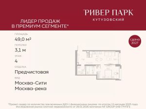 Продается 1-к квартира площадью 49.0 кв.м. на 4-м этаже в жилом комплексе премиум-класса Ривер Парк Кутузовский в Башне Бриллиант Премиальный жилой комплекс Ривер Парк Кутузовский строится в одном из самых престижных районов столицы Дорогомилово, на берегу Москвы-реки с лучшими видами на Москва-Сити. Яркий проект в стиле эко-футуризма станет самым масштабным и самым высотным ЖК в локации Кутузовского проспекта. Расположение и Транспортная доступность:• На берегу Москвы-реки, напротив Москва-Сити• 600 метров до Кутузовского проспекта• Удобный съезд с ТТК• Прямой выезд на МКАД по Проспекту Багратиона.• В пешей доступности 3 станции метро: Фили, Парк Победы, Кутузовская, а также станция МЦД Фили.Архитектура от именитого бюро ADM отличается уникальной пластикой фасадов - башни словно парят в воздухе, играя гранями как драгоценные камни. Жилой комплекс состоит из 5-ти небоскребов с приватным парком 2 Га и внешней торговой галереей с открытым доступом.В закрытом внутреннем дворе уникальная по насыщенности клубная инфраструктура только для жителей:• Площадка Мультиспорт (баскетбол, футбол, воллейбол, большой теннис)• Детский игровой клуб Немо • Музыкальная студия• Клуб Гедонист с бильярдной• Студия стиля для стилистов и массажа• Гольф-симулятор• КараокеВпервые в Москве лаунж-зоны на крыше небоскребов, только для жителей:• Всесезонные беседки иглу• Джакузи• Гриль• Площадка для занятий йогой• Самые высоки качели на крыше в России• Видовые площадкиБлагоустройство комплекса занимает 3 гектара и разработано мировым экспертом по городским парковым ландшафтам - голландским бюро WEST8. Концепция проекта дать жителям отдохнуть от городского ритма и расслабиться среди природы. В Приватном парке уже высажены хвойные деревья-крупномеры сосны и ели. • Зеркальный пруд с арт-объектом• Две детские площадки• Точка спорта с тренажерами и турниками• Цветущий сад• Зеленый театр со сценой и проектором• Видовая зона отдыха с очагом• Солнечная терраса с лежакамиНа территории жилого комплекса планируется строительство коммерческого образовательного центра, включающего детский сад на 200 мест и школу на 460 мест.