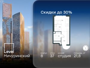Цена указана с учётом скидки при 100%-й оплате, несубсидированной ипотеке, рассрочке (кроме программы ''Рассрочка 0%''). В жилом квартале, расположенном на границе с природным заказником ''Долина реки Очаковки'', продаётся студия площадью 21.90 кв.м без отделки. Квартира расположена на 27 этаже 48-этажного корпуса 8 в жилом комплексе бизнес-класса Level Мичуринский (компания Level Group/Левел групп). Отличная транспортная доступность: - от 10 мин. пешком до станции метро ''Мичуринский проспект''- 15 мин. пешком до станции метро ''Аминьевская''- 7 мин. на авто до МКАД- 10 мин. на авто до ТТК- 15 мин. на авто до Москва-Сити Продуманный архитектурный проект:- Выразительная архитектура от известных бюро: корпуса 1-6 - СПИЧ, корпуса 7-13 - Borisov Architects,- Из окон открываются живописные виды на парки, Москва-Сити и МГУ,- Высокие потолки до 6,35 м,- Стильные лобби с окнами в пол и высокими потолками до 4,7 м,- С каждого этажа дома на лифте можно спуститься в подземный отапливаемый паркинг.Расположение:Level Мичуринский строится в одном из самых зелёных районов Москвы - Очаково-Матвеевское. Этот уголок столицы идеален для поддержания здорового образа жизни. В шаговой доступности от проекта находятся заказник ''Долина реки Очаковки'' - 1 мин. пешком и Очаковский парк - 7 мин. пешком. На велосипеде можно добраться до таких парков, как ''Событие'', парк Олимпийской деревни, парк 50-летия Октября и парк Школьников.В 15 минутах езды на авто расположено более 30 детских садов (из них 14 в пешей доступности), 32 школы (из них 13 в пешей доступности) и 14 вузов. Также в ближайшем окружении - более 25 медицинских учреждений, 11 спортивных клубов и 22 продуктовых супермаркета.Внутренняя инфраструктура:На территории жилого комплекса строится три детских сада и школа. На первых этажах домов откроется супермаркет, фитнес-центр, ресторан, кафе и другие сервисы. Подземные этажи займут паркинги: трёхуровневые - в этапах 1 и 2, одноуровневый - в этапах 3 и 4.Преимущества проекта:- 4,5 га благоустроенной территории с видовым мостом, уличным кинотеатром, зонами для тихого отдыха, работы, воркаута, площадки для петанка, футбола, настольного тенниса и пляжного волейбола.- Дизайнерские лобби с панорамным видом на двор, мойками для лап животных и комфортными зонами ожидания.- Безопасность жителей: круглосуточное видеонаблюдение всех зон общего пользования (лобби, лифты, паркинги, детские площадки), система контроля доступа, управление видеодомофоном через мобильное приложение, единый ключ доступа на территорию жилого комплекса.- Технологии и комфорт: высокоскоростной Wi-Fi в лобби и на придомовой территории, автоматическая система контроля и учёта ресурсов, абонентская связь с консьержем, распознавание номеров автомобилей при въезде в паркинг и выезде из него.