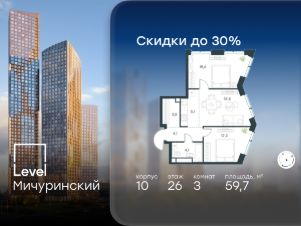 Цена указана с учётом скидки при 100%-й оплате, несубсидированной ипотеке, рассрочке (кроме программы ''Рассрочка 0%''). В жилом квартале, расположенном на границе с природным заказником ''Долина реки Очаковки'', продаётся 3-комнатная квартира площадью 59.70 кв.м с отделкой white box. Квартира расположена на 26 этаже 42-этажного корпуса 10 в жилом комплексе бизнес-класса Level Мичуринский (компания Level Group/Левел групп). Отличная транспортная доступность: - от 10 мин. пешком до станции метро ''Мичуринский проспект''- 15 мин. пешком до станции метро ''Аминьевская''- 7 мин. на авто до МКАД- 10 мин. на авто до ТТК- 15 мин. на авто до Москва-Сити Продуманный архитектурный проект:- Выразительная архитектура от известных бюро: корпуса 1-6 - СПИЧ, корпуса 7-13 - Borisov Architects,- Из окон открываются живописные виды на парки, Москва-Сити и МГУ,- Высокие потолки до 6,35 м,- Стильные лобби с окнами в пол и высокими потолками до 4,7 м,- С каждого этажа дома на лифте можно спуститься в подземный отапливаемый паркинг.Расположение:Level Мичуринский строится в одном из самых зелёных районов Москвы - Очаково-Матвеевское. Этот уголок столицы идеален для поддержания здорового образа жизни. В шаговой доступности от проекта находятся заказник ''Долина реки Очаковки'' - 1 мин. пешком и Очаковский парк - 7 мин. пешком. На велосипеде можно добраться до таких парков, как ''Событие'', парк Олимпийской деревни, парк 50-летия Октября и парк Школьников.В 15 минутах езды на авто расположено более 30 детских садов (из них 14 в пешей доступности), 32 школы (из них 13 в пешей доступности) и 14 вузов. Также в ближайшем окружении - более 25 медицинских учреждений, 11 спортивных клубов и 22 продуктовых супермаркета.Внутренняя инфраструктура:На территории жилого комплекса строится три детских сада и школа. На первых этажах домов откроется супермаркет, фитнес-центр, ресторан, кафе и другие сервисы. Подземные этажи займут паркинги: трёхуровневые - в этапах 1 и 2, одноуровневый - в этапах 3 и 4.Преимущества проекта:- 4,5 га благоустроенной территории с видовым мостом, уличным кинотеатром, зонами для тихого отдыха, работы, воркаута, площадки для петанка, футбола, настольного тенниса и пляжного волейбола.- Дизайнерские лобби с панорамным видом на двор, мойками для лап животных и комфортными зонами ожидания.- Безопасность жителей: круглосуточное видеонаблюдение всех зон общего пользования (лобби, лифты, паркинги, детские площадки), система контроля доступа, управление видеодомофоном через мобильное приложение, единый ключ доступа на территорию жилого комплекса.- Технологии и комфорт: высокоскоростной Wi-Fi в лобби и на придомовой территории, автоматическая система контроля и учёта ресурсов, абонентская связь с консьержем, распознавание номеров автомобилей при въезде в паркинг и выезде из него.