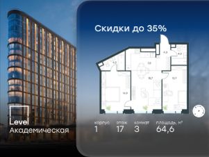 Цена указана с учётом скидки при 100%-й оплате, несубсидированной ипотеке, рассрочке (кроме программы ''Рассрочка 0%''). В Академическом районе продаётся 3-комнатная квартира площадью 64.60 кв.м без отделки. Квартира расположена на 17-м этаже 19-этажного жилого комплекса бизнес-класса Level Академическая (компания Level Group). Площади помещений определены кадастровым инженером по результатам обмеров.Отличная транспортная доступность:- 1 мин. пешком до станции метро ''Академическая'',- 4 мин. на автомобиле до ТТК,- 8 мин. на автомобиле до Садового кольца,- 13 мин. на автомобиле до Кремля. Продуманный архитектурный проект:- современная архитектура от бюро UNK project,- высокие потолки в квартирах до 6,62 м,- окна в пол высотой 2,5-2,68 м с панорамным видом на МГУ, Москва-Сити и другие доминанты Москвы,- квартиры с моллированным остеклением - радиусные окна открывают увеличенный угол обзора,- более 20 вариантов планировочных решений,- уникальные квартиры с собственным патио и возможностью обустройства дровяного камина,- квартиры сдаются без отделки, что открывает свободу для создания интерьера по своему вкусу. Расположение:Камерный проект из 1 корпуса расположен тихом зеленом районе Москвы, в непосредственной близости к центру города. В округе построено 80 детских садов, 50 школ и 30 вузов, 7 из которых входят в топ100 вузов России: МГУ, МГИМО, РАНХиГС, МИСИС, РУДН, РЭУ им. Плеханова и РГУ нефти и газа им. Губкина.Этот район буквально утопает в зелени парков, начиная с уютного Академического в 6 минутах пешком и заканчивая одним из крупнейших в городе парком 50-летия Октября (12 минут на автомобиле). Общая площадь природных объектов в радиусе 2-6 км от дома - 476,5 га. Внутренняя инфраструктура:На территории Level Академическая откроется собственный торговый центр, а для отдыха жителей будут созданы общественные пространства: комфортное лобби с дизайнерской отделкой, окнами в пол и потолками высотой 4,5 м, а также две благоустроенные зоны - территория по периметру здания и пространство на стилобате. Во дворе на стилобате предусмотрены детская и спортивная площадки, коворкинг и лаунж-зона на открытом воздухе. Стилобат украсят скульптуры животных - жирафа, зайца и волка, которые станут ярким акцентом внутреннего двора Level Академическая, подчеркивая близость к музею Дарвина. Процент озеленения территории - 58%. Технологии и безопасность:Жителей Level Академическая не коснется ежегодное отключение горячей воды благодаря собственным центральным водонагревателям. Безопасность гарантирует круглосуточная охрана, безлимитный Wi-Fi, круглосуточное видеонаблюдение. Удобное перемещение внутри комплекса будут обеспечивать 5 лифтов с доступом в паркинг с жилых этажей.