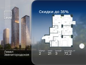 Цена указана с учётом скидки при 100%-й оплате, несубсидированной ипотеке, рассрочке (кроме программы ''Рассрочка 0%'').В жилом квартале продаётся 3-комнатная квартира площадью 72.30 кв.м white box. Квартира расположена на 10 этаже 48 этажного корпуса 1 в жилом комплексе комфорт класса Левел Звенигородская (компания Level Group/Левел групп). Отличная транспортная доступность- 5 мин. пешком до метро ''Звенигородская'' (откроется к окончанию строительства),- 18 мин. пешком до станции МЦК ''Хорошёво'' и станции БКЛ ''Народное ополчение'',- 4 мин. на авто до ТТК,- 8 мин. на авто до Садового кольца,- 15 мин. на авто до Кремля. Продуманный архитектурный проект- Концепция от студии Станислава Михаловского, в основу которой легло единение природы и города,- Двухкамерные стеклопакеты в окнах, алюминиевый и ПВХ профиль - в квартирах тепло зимой и прохладно летом,- С верхних этажей откроются панорамные виды на город, Москву-реку, ''Москва-Сити'' и Москворецкий парк,- Лобби со всеми удобствами: окна в пол, высокие потолки до 4,7 м, лаунж-зоны, колясочные, гостевые санузлы и мойки для лап животных,- Централизованные водонагреватели гарантируют круглогодичную подачу горячей воды в каждую квартиру. БлагоустройствоКонцепция благоустройства разработана совместно с бюро UNK landscape. Высота башен приближается к 200 метрам - они словно касаются неба. Небесный простор проецируется на территорию двора с помощью подсветки, визуально увеличивая пространство и отражаясь в авторских элементах архитектуры.На территории площадью 0,45 га расположатся:- ''Облако событий'' - место встреч и общения,- ''Облако спорта'' - всё для поддержания себя в форме,- ''Облако принятия решений'' - пространство для работы на свежем воздухе,- ''Облако спокойствия'' - для отдыха в тишине природы,- ''Облако игр'' - площадки для подростков и самых маленьких. ИнфраструктураВ жилом комплексе откроется 21 коммерческое помещение: продуктовые лавки, кафе, салоны красоты, службы доставки и творческие студии.Этап 1 включает строительство двухуровневого подземного паркинга. Всего здесь расположится 351 машино-место, включая семейные места, и 264 кладовых помещения.В распоряжении жителей развитая инфраструктура района: 15 супермаркетов, 5 спортивных объектов, 9 медучреждений, 7 детских садов, 4 школы, 3 благоустроенных парка - всё в шаговой доступности. ИнженерияКомфортное перемещение внутри домов будут обеспечивать надёжные лифты с доступом в паркинг с жилых этажей. В каждом корпусе предусмотрено до шести кабин, включая сервисные лифты.Попасть на территорию комплекса можно только по единому ключу доступа. Видеонаблюдение установлено на входах в подъезды, в лобби, в общих зонах, на въезде в паркинг. Гости смогут связаться с жителями дома через входные видеопанели, а управлять доступом на территорию можно через видеодомофон или приложение на телефоне.