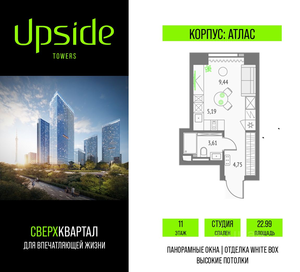 Продаётся студия площадью 22.99 кв.м на 11 этаже 47 этажного корпуса Атлас в квартале небоскребов ''Upside Towers''. В квартире отделка White-box, c видом на корпус Эльбрус, прогулочный бульвар. Номер квартиры Б1103. Upside Towers - технологичный квартал строится в динамично развивающемся Бутырском районе, в 3 мин. от метро, в 5 мин. от ТТК. На территории 7 га возводится 5 высотных башен от 19 до 58 этажей, названных в честь главных вершин земли. Квартиры с панорамными окнами в пол, высокими потолками и современными инженерными решениями. Благоустроенная зеленая территория включает: приватные дворы, природный комплекс, прогулочный бульвар, ландшафтный парк 2,5 га с сенсорным садом и многофункциональными игровыми и спортивными площадками. В корпусе откроются магазины, кафе и рестораны, а также другие объекты коммерческой инфраструктуры. На последнем этаже корпуса предусмотрен SPA Relax центр с панорамным видом на город. Собственники квартир смогут в любое удобное для них время забронировать посещение спа-зоны через смарт-приложение. Дня них будут доступны джакузи, пространства для занятий йогой, а также места для отдыха и релаксации. Большое внимание в проекте уделяется созданию социальной инфраструктуры. Между ''Атласом'' и ''Олимпом'' в трехэтажном стилобате разместится уникальное пространство закрытый клуб для жителей квартала Upside Club площадью 2 000 кв. м. Здесь появится каминный зал с роялем, многофункциональная детская зона c двухуровневым игровым оборудованием для малышей и дошкольников, плей-рум для подростков, домашний кинотеатр, коворкинг, переговорные и лектории. На крыше стилобата разместится всесезонная BBQ патио-зона с верандой и закрытыми помещениями для приготовления и отдыха. В башнях откроются смотровые террасы для резидентов с панорамными видами на город, парки, Останкинскую башню, ВДНХ, Ботанический сад и Москва-Сити. Покупая квартиру даже самого минимального размера в Upside Towers, вы получаете в пользование 2 000 м² бесплатных общественных пространств. В рамках проекта строится государственная школа и детский сад, разместится более 15 000 кв.м. коммерческой инфраструктуры. Насыщенная социальная инфраструктура формирует множество сценариев для жизни на территории квартала. В Upside Towers применяются лучшие технологии и практики, чтобы обеспечить высшее качество жизни: Воздух, не уступающий по качеству горному, обеспечит приточно-вытяжная вентиляция. Пятиступенчатая очистка воды с сохранением полезных минералов. Центральное кондиционирование. Внутрипольные конвекторы с естественной конвекцией. Современные системы безопасности и мониторинга микроклимата. Высокоскоростной интернет на всей территории, в квартирах и паркинге за счет усиления GSM-связи всех ведущих операторов. Все места в подземном паркинге оборудованы зарядками для электрокаров. Бутырский район непрерывно развивается и готовится стать новым современным деловым районом Москвы. В рамках программы ''Индустриальные кварталы'' комплексного развития территори