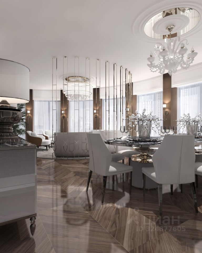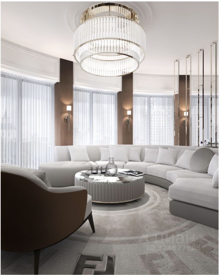 Просторная светлая квартира площадью 207.7 кв. м с окнами на северной и западной сторонах. В кухне-гостиной (58 кв. м) они обращены в направлении Кремля, а панорамное остекление, моллированное окно и открытые балконы улучшают видовые характеристики квартиры. Продуманная планировка позволяет разместить кабинет и три спальни с отдельными санузлами и гардеробными. Окна комнат выходят в тихий приватный двор-парк с живописным ландшафтным дизайном, фонтаном и ручьём. ''Лаврушинский'' - бескомпромиссный дом с лучшими видами на Кремль. Благодаря расположению всего в одном километре от Кремля, своей высоте и малоэтажной окружающей застройке, из квартир открываются поразительные прямые виды на главные достопримечательности центра Москвы, включая храм Христа Спасителя и собор Василия Блаженного. Расположение в глубине квартала, посередине парка, дает удивительное для центра ощущение тишины и простора. На закрытой территории находится самый большой на элитном рынке собственный ландшафтный парк площадью 1,4 га с фонтаном, ручьём, зонами для воркаута и тихого отдыха. KIDS LAB: развивающая детская площадка на улице и игровая комната в помещении. FIT LAB: фитнес-клуб с 25-метровым бассейном, beauty room, доступные только для жителей. В проекте уникальный выбор квартир с просторными балконами, пентхаусов с террасами, бассейнами и каминами, максимальными видовыми характеристиками, а также роскошных вилл. Всего - 153 квартиры и 101 продуманное планировочное решение. Высота потолков составляет от 3,5 до 8,25 м. В доме предусмотрен 2х-уровневый паркинг на 279 машино-места. В доме предусмотрен полный комплекс систем комфорта, включающий приточно-вытяжную вентиляцию с тонкой фильтрацией с принципом забора воздуха с высоты 50 метров для повышения продолжительности жизни, отдельный сервисный лифт для обслуживающего персонала и другие современные системы.