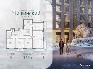 В продаже 4-комнатная квартира квартира в элитном квартале ''Тишинский бульвар''.Общая площадь квартиры - 136.70 кв.м. Этаж 3 из 14.Корпус К3.''Тишинский бульвар'' - тихий зелёный элитный квартал на Тишинке, в престижном и комфортном районе центра Москвы. В нём создан уникальный для элитного дома прогулочный бульвар в своём огромном парке 1,9 га. В парке оборудованы зоны для активного и тихого отдыха, крытые галереи, приватные зелёные комнаты, многофункциональная спортивная площадка, воркаут-зона, детская площадка, сухой фонтан, ручей.В пешей доступности Римско-католический кафедральный собор. Всего в полутора километрах от квартала находятся Патриаршие пруды - излюбленное место для летних прогулок, воскресных бранчей и романтических ужинов. Белая площадь расположена ещё ближе - на расстоянии 1,2 километра. Это точка концентрации деловой жизни и модных ресторанов.В ''Тишинский бульваре'' только для жителей и их гостей создан уникальный для элитного дома прогулочный бульвар в собственном огромном парке площадью 2,1 га, который занимает 70% территории квартала. Бульвар проходит через весь квартал и объединяет в общее пространство три двора: Кленовый, Рябиновый и Ивовый.В парке созданы крытые галереи и приватные зелёные комнаты для отдыха и медитаций в любую погоду. Насыщенное озеленение многолетними растениями с разными периодами цветения сохраняет территорию квартала красивой круглый год.В квартале насыщенная инфраструктура только для жителей, включая Clubhouse. Здесь оборудованы пространства для здорового образа жизни по стандарту FIT LAB: в парке - многофункциональная спортивная площадка, воркаут-зона, место для занятий йогой и медитации, бесплатный фитнес-клуб с бассейном. Для маленьких жителей доступны детская площадка и игровая комната по стандарту KIDS LAB.Дома оснащены самыми полными и лучшими системами.