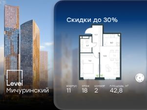 Цена указана с учётом скидки при 100%-й оплате, несубсидированной ипотеке, рассрочке (кроме программы ''Рассрочка 0%''). В жилом квартале, расположенном на границе с природным заказником ''Долина реки Очаковки'', продаётся 2-комнатная квартира площадью 42.80 кв.м с отделкой white box. Квартира расположена на 18 этаже 24-этажного корпуса 11 в жилом комплексе бизнес-класса Level Мичуринский (компания Level Group/Левел групп). Отличная транспортная доступность: - от 10 мин. пешком до станции метро ''Мичуринский проспект''- 15 мин. пешком до станции метро ''Аминьевская''- 7 мин. на авто до МКАД- 10 мин. на авто до ТТК- 15 мин. на авто до Москва-Сити Продуманный архитектурный проект:- Выразительная архитектура от известных бюро: корпуса 1-6 - СПИЧ, корпуса 7-13 - Borisov Architects,- Из окон открываются живописные виды на парки, Москва-Сити и МГУ,- Высокие потолки до 6,35 м,- Стильные лобби с окнами в пол и высокими потолками до 4,7 м,- С каждого этажа дома на лифте можно спуститься в подземный отапливаемый паркинг.Расположение:Level Мичуринский строится в одном из самых зелёных районов Москвы - Очаково-Матвеевское. Этот уголок столицы идеален для поддержания здорового образа жизни. В шаговой доступности от проекта находятся заказник ''Долина реки Очаковки'' - 1 мин. пешком и Очаковский парк - 7 мин. пешком. На велосипеде можно добраться до таких парков, как ''Событие'', парк Олимпийской деревни, парк 50-летия Октября и парк Школьников.В 15 минутах езды на авто расположено более 30 детских садов (из них 14 в пешей доступности), 32 школы (из них 13 в пешей доступности) и 14 вузов. Также в ближайшем окружении - более 25 медицинских учреждений, 11 спортивных клубов и 22 продуктовых супермаркета.Внутренняя инфраструктура:На территории жилого комплекса строится три детских сада и школа. На первых этажах домов откроется супермаркет, фитнес-центр, ресторан, кафе и другие сервисы. Подземные этажи займут паркинги: трёхуровневые - в этапах 1 и 2, одноуровневый - в этапах 3 и 4.Преимущества проекта:- 4,5 га благоустроенной территории с видовым мостом, уличным кинотеатром, зонами для тихого отдыха, работы, воркаута, площадки для петанка, футбола, настольного тенниса и пляжного волейбола.- Дизайнерские лобби с панорамным видом на двор, мойками для лап животных и комфортными зонами ожидания.- Безопасность жителей: круглосуточное видеонаблюдение всех зон общего пользования (лобби, лифты, паркинги, детские площадки), система контроля доступа, управление видеодомофоном через мобильное приложение, единый ключ доступа на территорию жилого комплекса.- Технологии и комфорт: высокоскоростной Wi-Fi в лобби и на придомовой территории, автоматическая система контроля и учёта ресурсов, абонентская связь с консьержем, распознавание номеров автомобилей при въезде в паркинг и выезде из него.