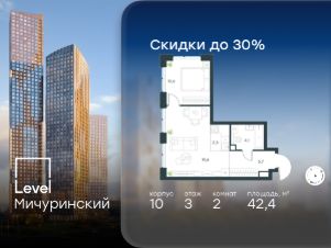 Цена указана с учётом скидки при 100%-й оплате, несубсидированной ипотеке, рассрочке (кроме программы ''Рассрочка 0%''). В жилом квартале, расположенном на границе с природным заказником ''Долина реки Очаковки'', продаётся 2-комнатная квартира площадью 42.40 кв.м с отделкой white box. Квартира расположена на 3 этаже 42-этажного корпуса 10 в жилом комплексе бизнес-класса Level Мичуринский (компания Level Group/Левел групп). Отличная транспортная доступность: - от 10 мин. пешком до станции метро ''Мичуринский проспект''- 15 мин. пешком до станции метро ''Аминьевская''- 7 мин. на авто до МКАД- 10 мин. на авто до ТТК- 15 мин. на авто до Москва-Сити Продуманный архитектурный проект:- Выразительная архитектура от известных бюро: корпуса 1-6 - СПИЧ, корпуса 7-13 - Borisov Architects,- Из окон открываются живописные виды на парки, Москва-Сити и МГУ,- Высокие потолки до 6,35 м,- Стильные лобби с окнами в пол и высокими потолками до 4,7 м,- С каждого этажа дома на лифте можно спуститься в подземный отапливаемый паркинг.Расположение:Level Мичуринский строится в одном из самых зелёных районов Москвы - Очаково-Матвеевское. Этот уголок столицы идеален для поддержания здорового образа жизни. В шаговой доступности от проекта находятся заказник ''Долина реки Очаковки'' - 1 мин. пешком и Очаковский парк - 7 мин. пешком. На велосипеде можно добраться до таких парков, как ''Событие'', парк Олимпийской деревни, парк 50-летия Октября и парк Школьников.В 15 минутах езды на авто расположено более 30 детских садов (из них 14 в пешей доступности), 32 школы (из них 13 в пешей доступности) и 14 вузов. Также в ближайшем окружении - более 25 медицинских учреждений, 11 спортивных клубов и 22 продуктовых супермаркета.Внутренняя инфраструктура:На территории жилого комплекса строится три детских сада и школа. На первых этажах домов откроется супермаркет, фитнес-центр, ресторан, кафе и другие сервисы. Подземные этажи займут паркинги: трёхуровневые - в этапах 1 и 2, одноуровневый - в этапах 3 и 4.Преимущества проекта:- 4,5 га благоустроенной территории с видовым мостом, уличным кинотеатром, зонами для тихого отдыха, работы, воркаута, площадки для петанка, футбола, настольного тенниса и пляжного волейбола.- Дизайнерские лобби с панорамным видом на двор, мойками для лап животных и комфортными зонами ожидания.- Безопасность жителей: круглосуточное видеонаблюдение всех зон общего пользования (лобби, лифты, паркинги, детские площадки), система контроля доступа, управление видеодомофоном через мобильное приложение, единый ключ доступа на территорию жилого комплекса.- Технологии и комфорт: высокоскоростной Wi-Fi в лобби и на придомовой территории, автоматическая система контроля и учёта ресурсов, абонентская связь с консьержем, распознавание номеров автомобилей при въезде в паркинг и выезде из него.