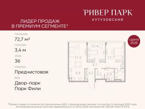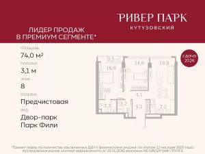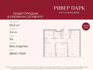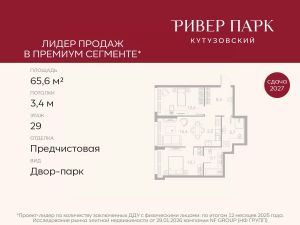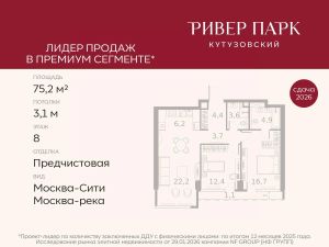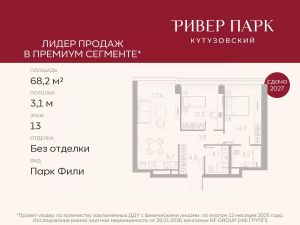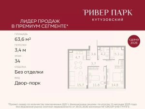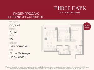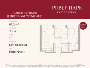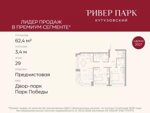 Продается 2-к квартира площадью 62.4 кв.м. на 29-м этаже в жилом комплексе премиум-класса Ривер Парк Кутузовский в Башне Бриллиант Премиальный жилой комплекс Ривер Парк Кутузовский строится в одном из самых престижных районов столицы Дорогомилово, на берегу Москвы-реки с лучшими видами на Москва-Сити. Яркий проект в стиле эко-футуризма станет самым масштабным и самым высотным ЖК в локации Кутузовского проспекта. Расположение и Транспортная доступность:• На берегу Москвы-реки, напротив Москва-Сити• 600 метров до Кутузовского проспекта• Удобный съезд с ТТК• Прямой выезд на МКАД по Проспекту Багратиона.• В пешей доступности 3 станции метро: Фили, Парк Победы, Кутузовская, а также станция МЦД Фили.Архитектура от именитого бюро ADM отличается уникальной пластикой фасадов - башни словно парят в воздухе, играя гранями как драгоценные камни. Жилой комплекс состоит из 5-ти небоскребов с приватным парком 2 Га и внешней торговой галереей с открытым доступом.В закрытом внутреннем дворе уникальная по насыщенности клубная инфраструктура только для жителей:• Площадка Мультиспорт (баскетбол, футбол, воллейбол, большой теннис)• Детский игровой клуб Немо • Музыкальная студия• Клуб Гедонист с бильярдной• Студия стиля для стилистов и массажа• Гольф-симулятор• КараокеВпервые в Москве лаунж-зоны на крыше небоскребов, только для жителей:• Всесезонные беседки иглу• Джакузи• Гриль• Площадка для занятий йогой• Самые высоки качели на крыше в России• Видовые площадкиБлагоустройство комплекса занимает 3 гектара и разработано мировым экспертом по городским парковым ландшафтам - голландским бюро WEST8. Концепция проекта дать жителям отдохнуть от городского ритма и расслабиться среди природы. В Приватном парке уже высажены хвойные деревья-крупномеры сосны и ели. • Зеркальный пруд с арт-объектом• Две детские площадки• Точка спорта с тренажерами и турниками• Цветущий сад• Зеленый театр со сценой и проектором• Видовая зона отдыха с очагом• Солнечная терраса с лежакамиНа территории жилого комплекса планируется строительство коммерческого образовательного центра, включающего детский сад на 200 мест и школу на 460 мест.