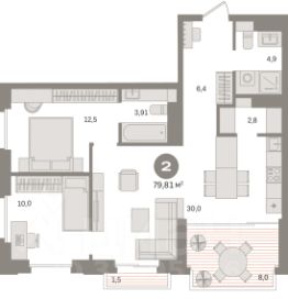 Двухкомнатная квартира 79,81 м² в ЖК Монс Сдержанный, современный формат для тех, кто ценит пространство. Почти 80 м² — редкий метраж для двухкомнатной квартиры: здесь нет ощущения компромисса.ПланировкаОбщая площадь — 79,81 м²Кухня-гостиная — 30 м²Комнаты — 12,5 м² и 10 м² (изолированные)ГардеробнаяЛоджияОкна в полКлючевой элемент — кухня-гостиная 30 м². Это полноценное общественное пространство: зона кухни, столовая и гостиная естественно объединены, при этом спальни остаются приватными. Панорамное остекление добавляет объёма и света, а гардеробная снимает вопрос хранения без перегрузки интерьера шкафамиО проектеЖК Монс — проект компании Брусника, девелопера, известного вниманием к архитектуре и качеству городской среды. Для проектов Брусники характерны:• выразительная современная архитектура и аккуратные фасады,• закрытые дворы без машин с продуманным ландшафтным дизайном,• общественные пространства с чётким зонированием — места для отдыха, работы и встреч,• сквозные входные группы на уровне земли и прозрачные лобби.Комплекс формируется как цельный квартал, а не точечная застройка, что напрямую влияет на комфорт проживанияСреда и инфраструктураВнутри проекта предусмотрены коммерческие помещения на первых этажах — магазины, кафе, сервисы повседневного спроса.Благоустройство ориентировано на приватность и безопасность: дворы освобождены от транзитного транспорта, предусмотрены прогулочные маршруты и зоны отдыха.Локация комплекса обеспечивает доступ к сформированной городской инфраструктуре района — образовательные учреждения, медицинские центры и торговые объекты находятся в разумной доступностиПочему это достойный вариант• Почти 80 м² — редкий объём для двухкомнатного формата.• Кухня-гостиная 30 м² — пространство уровня трёхкомнатной квартиры.• Панорамные окна — больше света и ощущение высоты.• Гардеробная и лоджия — практичные детали, которые действительно важны в повседневной жизни.• Проект от застройщика с устойчивой репутацией и вниманием к архитектуре.Если важны не только квадратные метры, но и качество среды — этот вариант стоит рассмотреть отдельно