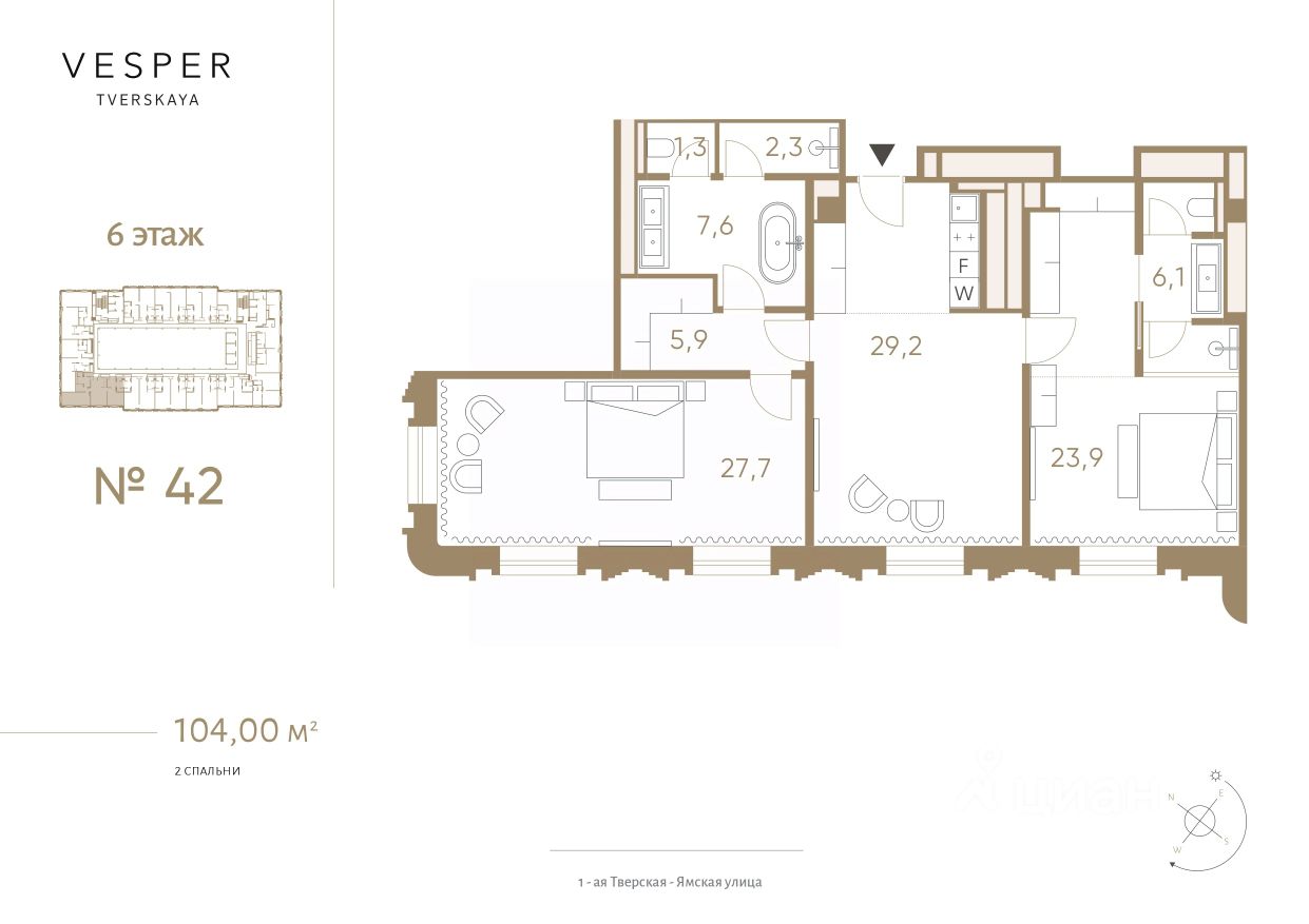Продаются апартаменты с отделкой и мебелью с сервисом 5* отеля на 6-м этаже общей площадью 104 метров с 2-мя спальнями и кухней-гостиной. Дом готов. О жилом комплексе Исключительный проект на главной улице Москвы, меняющий эстетику жизни в современном мегаполисе. Компания Vesper представляет проект на Тверской — апартаменты класса de luxe с отделкой и мебелью, с сервисом и инфраструктурой. Проект Vesper Tverskaya завершает архитектурный ансамбль Тверской, занимая последний свободный участок главной улицы города — в самом центре культурной, деловой и ночной жизни Москвы. Два здания, в которых расположены апартаменты, создают единый ансамбль. Они соединены общими этажами, где расположены wellness-клуб с бассейном и СПА и паркинг. При этом у каждого из зданий отдельный вход. О застройщике Девелопер проекта Vesper специализируется в премиальном сегменте клубной жилой недвижимости. Портфель компании включает в себя 22 проекта в Москве и странах Европы. Актуальные архитектурные проекты, индивидуальный дизайн, передовые технологии, качественные материалы и лучшие мировые практики воплощены в каждом доме компании. Расположение и транспортная доступность Расположение в самом центре, на Тверской улице, создает особый ритм жизни. Всё, чем может заинтересовать один из крупнейших мегаполисов мира, располагается прямо перед вашими окнами.Всего в паре шагов — Патриаршие пруды, один из самых модных и концептуальных районов города. Гастрономические рестораны и энотеки, театры, музеи, лучшие школы — формируют идеальную среду для проживания в мегаполисе. Из апартаментов открываются панорамные виды на динамичную главную улицу города, Триумфальную площадь, исторические особняки. Архитектура Здания, проект которых разработан архитектурным бюро SPEECH под руководством Сергея Чобана, виртуозно балансируют между классической и новаторской концепциями. Проект органично вписывается в элегантный ряд исторических зданий Тверской, привнося свежий акцент своей современной интерпретацией классических форм и пропорций. Все апартаменты предлагаются с высококачественной отделкой с использованием мрамора, дерева ценных пород и текстиля, включающей оборудованные кухни и ванные комнаты. Дом оснащен многоуровневой системой очистки воды, централизованной системой кондиционирования и повышенной шумоизоляцией окон. Инфраструктура Wellness-клуб с 20 метровым бассейном, фитнес центр и СПА, просторные lounge-зоны — все эти преимущества доступны владельцам апартаментов. Доставить ужин из ресторана к приходу гостей или сделать уборку дома к возвращению из командировки — все это можно доверить сервису Vesper Tverskaya, не сомневаясь в качестве результата. Сервисы: -Консьерж-сервис 24/7 -Портье -Услуги горничной -Техническое обслуживание апартаментов Техническое оснащение дома: -Инновационная система микроклимата TION -Увлажнение воздуха, система центрального кондиционирования типа VRF -Многоуровневая система очистки воды -Бе
