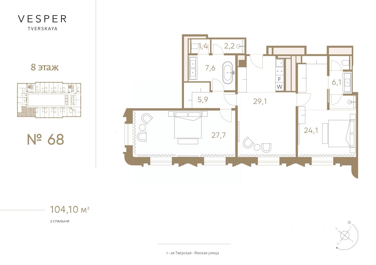 Продаются апартаменты с отделкой и мебелью с сервисом 5* отеля на 5-м этаже общей площадью 104.2 метров с 2-мя спальнями и кухней-гостиной. Дом готов. О жилом комплексе Исключительный проект на главной улице Москвы, меняющий эстетику жизни в современном мегаполисе. Компания Vesper представляет проект на Тверской — апартаменты класса de luxe с отделкой и мебелью, с сервисом и инфраструктурой. Проект Vesper Tverskaya завершает архитектурный ансамбль Тверской, занимая последний свободный участок главной улицы города — в самом центре культурной, деловой и ночной жизни Москвы. Два здания, в которых расположены апартаменты, создают единый ансамбль. Они соединены общими этажами, где расположены wellness-клуб с бассейном и СПА и паркинг. При этом у каждого из зданий отдельный вход. О застройщике Девелопер проекта Vesper специализируется в премиальном сегменте клубной жилой недвижимости. Портфель компании включает в себя 22 проекта в Москве и странах Европы. Актуальные архитектурные проекты, индивидуальный дизайн, передовые технологии, качественные материалы и лучшие мировые практики воплощены в каждом доме компании. Расположение и транспортная доступность Расположение в самом центре, на Тверской улице, создает особый ритм жизни. Всё, чем может заинтересовать один из крупнейших мегаполисов мира, располагается прямо перед вашими окнами.Всего в паре шагов — Патриаршие пруды, один из самых модных и концептуальных районов города. Гастрономические рестораны и энотеки, театры, музеи, лучшие школы — формируют идеальную среду для проживания в мегаполисе. Из апартаментов открываются панорамные виды на динамичную главную улицу города, Триумфальную площадь, исторические особняки. Архитектура Здания, проект которых разработан архитектурным бюро SPEECH под руководством Сергея Чобана, виртуозно балансируют между классической и новаторской концепциями. Проект органично вписывается в элегантный ряд исторических зданий Тверской, привнося свежий акцент своей современной интерпретацией классических форм и пропорций. Все апартаменты предлагаются с высококачественной отделкой с использованием мрамора, дерева ценных пород и текстиля, включающей оборудованные кухни и ванные комнаты. Дом оснащен многоуровневой системой очистки воды, централизованной системой кондиционирования и повышенной шумоизоляцией окон. Инфраструктура Wellness-клуб с 20 метровым бассейном, фитнес центр и СПА, просторные lounge-зоны — все эти преимущества доступны владельцам апартаментов. Доставить ужин из ресторана к приходу гостей или сделать уборку дома к возвращению из командировки — все это можно доверить сервису Vesper Tverskaya, не сомневаясь в качестве результата. Сервисы: -Консьерж-сервис 24/7 -Портье -Услуги горничной -Техническое обслуживание апартаментов Техническое оснащение дома: -Инновационная система микроклимата TION -Увлажнение воздуха, система центрального кондиционирования типа VRF -Многоуровневая система очистки воды -