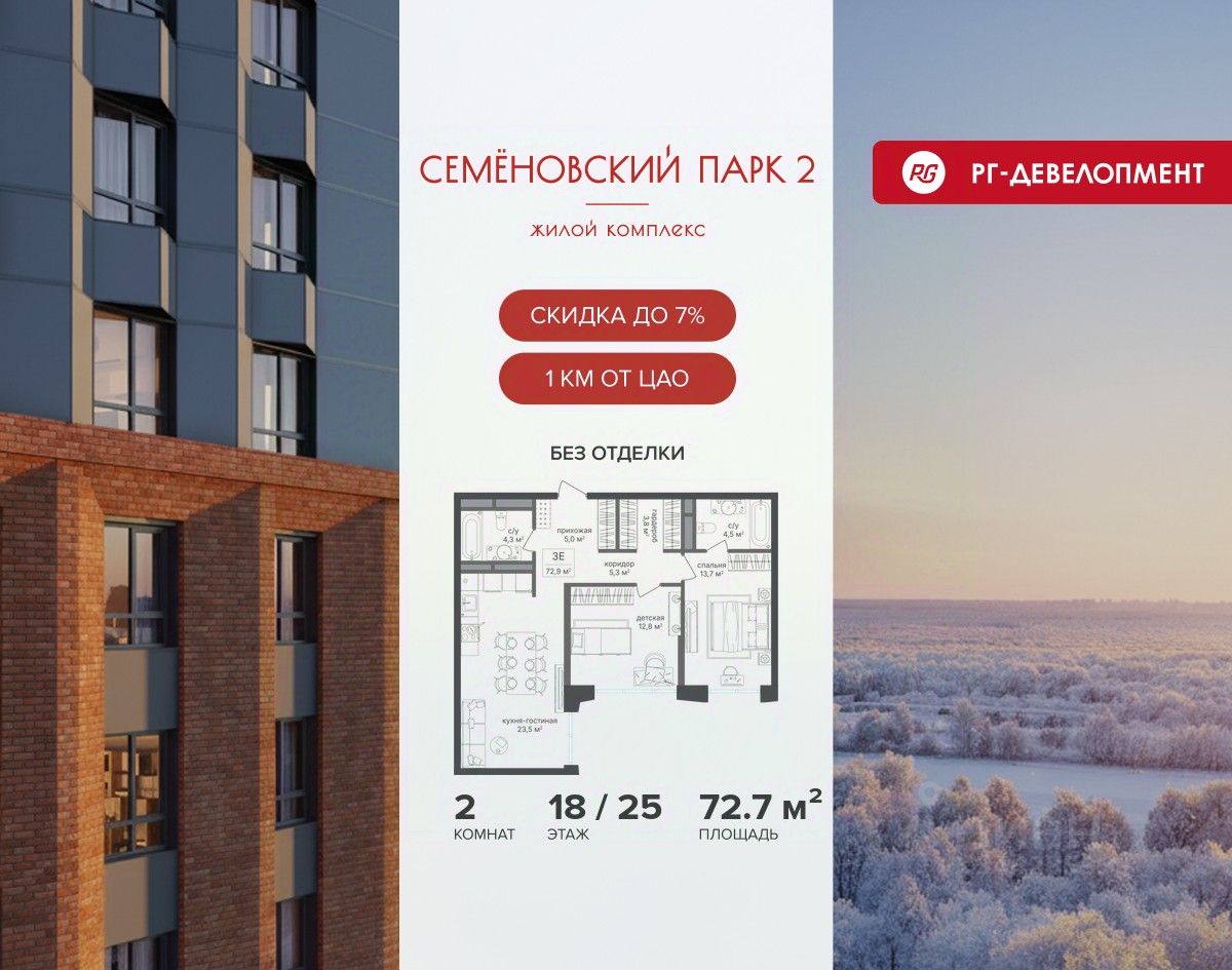 Ипотека для каждого! Полная стоимость кредита от 13,192% до 17,149%. Ставка от 0,11% в АО ''Альфа-Банк'', ген. лицензия ЦБ РФ 1326 от 16.01.2015. Ставка фиксируется на первые 12 месяцев, далее полная стоимость кредита от 22,022% до 24,599% ставка 21,59%. Первоначальный взнос — от 20,1% от стоимости квартиры. Срок кредитования — от 4 до 30 лет. Ипотека на весь срок! Полная стоимость кредита от 23,396% до 26,058% со ставкой 14,5%! Первоначальный взнос —от 20,01% от стоимости квартиры. Срок кредитования — от 3 до 30 лет. АО ''Банк ДОМ.РФ'' универсальная лицензия Банка России 2312 от 19.12.2018. Скидка 7% при покупке квартиры! Цена указана с учетом максимального размера скидки. Продается 2-к квартира 72,7 кв.м. в ЖК ''Семеновский парк 2'' на 18-м этаже 25 этажного дома. Компания ''РГ-Девелопмент'' предоставляет скидку на квартиры в жилом комплексе. Акция действительна до 15.03.2026 включительно. Чтобы воспользоваться предложением, необходимо подписать договор на приобретение недвижимости до 15.03.2026 включительно. Компания ''РГ-Девелопмент'' вошла в ТОП-10 девелоперов по объёму введённого жилья в ''Старой Москве'' по итогам 2025 года. Прямая продажа от застройщика! Квартиры без отделки. Срок сдачи корпуса - 1 кв. 2026 г. ЖК ''Семеновский парк 2'' - это идеальное место для того, чтобы стать вашим домом. Проект расположен в исторической части Москвы вблизи Измайловского лесопарка, в 1 км от ЦАО. 4 станции метро отделяют вас от Красной площади и 15 минут на автомобиле - от Садового кольца.