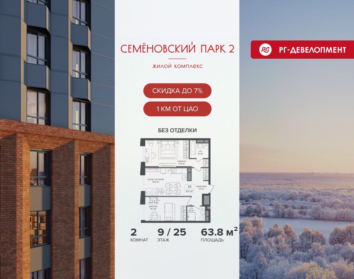 Ипотека для каждого! Полная стоимость кредита от 13,192% до 17,149%. Ставка от 0,11% в АО ''Альфа-Банк'', ген. лицензия ЦБ РФ 1326 от 16.01.2015. Ставка фиксируется на первые 12 месяцев, далее полная стоимость кредита от 22,022% до 24,599% ставка 21,59%. Первоначальный взнос — от 20,1% от стоимости квартиры. Срок кредитования — от 4 до 30 лет. Ипотека на весь срок! Полная стоимость кредита от 23,396% до 26,058% со ставкой 14,5%! Первоначальный взнос —от 20,01% от стоимости квартиры. Срок кредитования — от 3 до 30 лет. АО ''Банк ДОМ.РФ'' универсальная лицензия Банка России 2312 от 19.12.2018. Скидка 7% при покупке квартиры! Цена указана с учетом максимального размера скидки. Продается 2-к квартира 63,8 кв.м. в ЖК ''Семеновский парк 2'' на 9-м этаже 25 этажного дома. Компания ''РГ-Девелопмент'' предоставляет скидку на квартиры в жилом комплексе. Акция действительна до 15.03.2026 включительно. Чтобы воспользоваться предложением, необходимо подписать договор на приобретение недвижимости до 15.03.2026 включительно. Компания ''РГ-Девелопмент'' вошла в ТОП-10 девелоперов по объёму введённого жилья в ''Старой Москве'' по итогам 2025 года. Прямая продажа от застройщика! Квартиры без отделки. Срок сдачи корпуса - 1 кв. 2026 г. ЖК ''Семеновский парк 2'' - это идеальное место для того, чтобы стать вашим домом. Проект расположен в исторической части Москвы вблизи Измайловского лесопарка, в 1 км от ЦАО. 4 станции метро отделяют вас от Красной площади и 15 минут на автомобиле - от Садового кольца.