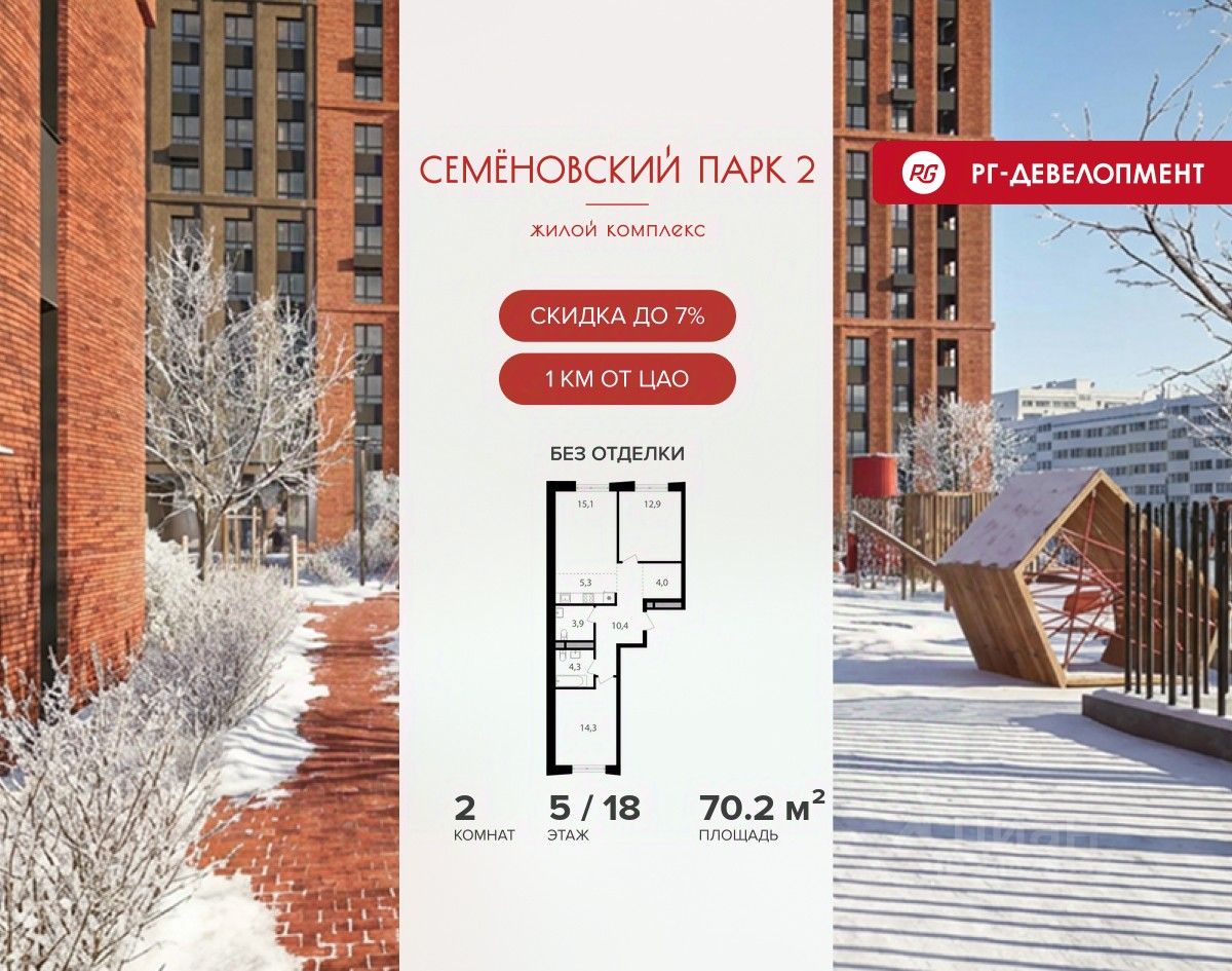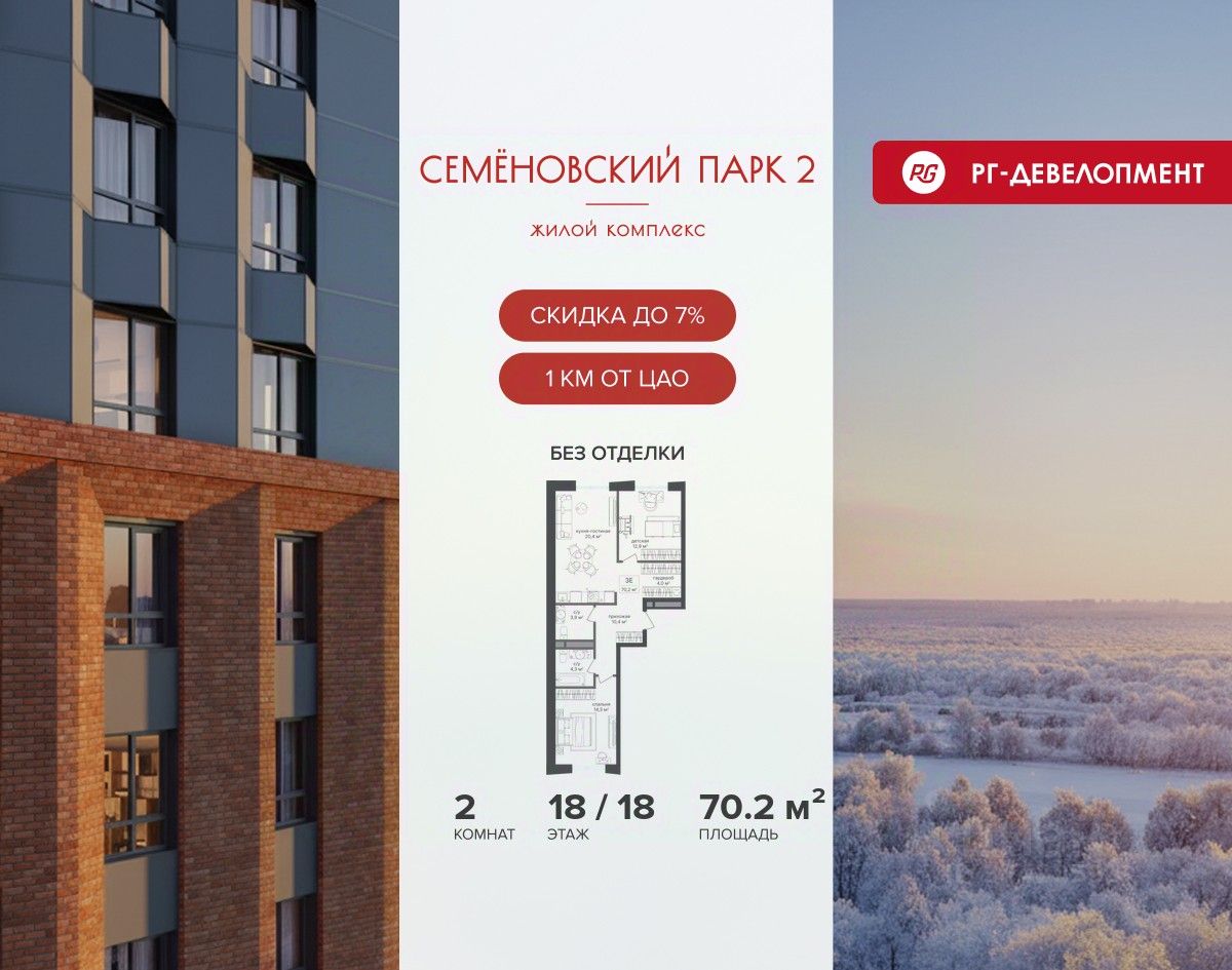 Ипотека для каждого! Полная стоимость кредита от 13,192% до 17,149%. Ставка от 0,11% в АО ''Альфа-Банк'', ген. лицензия ЦБ РФ 1326 от 16.01.2015. Ставка фиксируется на первые 12 месяцев, далее полная стоимость кредита от 22,022% до 24,599% ставка 21,59%. Первоначальный взнос — от 20,1% от стоимости квартиры. Срок кредитования — от 4 до 30 лет. Ипотека на весь срок! Полная стоимость кредита от 23,396% до 26,058% со ставкой 14,5%! Первоначальный взнос —от 20,01% от стоимости квартиры. Срок кредитования — от 3 до 30 лет. АО ''Банк ДОМ.РФ'' универсальная лицензия Банка России 2312 от 19.12.2018. Скидка 7% при покупке квартиры! Цена указана с учетом максимального размера скидки. Продается 2-к квартира 70,2 кв.м. в ЖК ''Семеновский парк 2'' на 18-м этаже 18 этажного дома. Компания ''РГ-Девелопмент'' предоставляет скидку на квартиры в жилом комплексе. Акция действительна до 15.03.2026 включительно. Чтобы воспользоваться предложением, необходимо подписать договор на приобретение недвижимости до 15.03.2026 включительно. Компания ''РГ-Девелопмент'' вошла в ТОП-10 девелоперов по объёму введённого жилья в ''Старой Москве'' по итогам 2025 года. Прямая продажа от застройщика! Квартиры без отделки. Срок сдачи корпуса - 1 кв. 2026 г. ЖК ''Семеновский парк 2'' - это идеальное место для того, чтобы стать вашим домом. Проект расположен в исторической части Москвы вблизи Измайловского лесопарка, в 1 км от ЦАО. 4 станции метро отделяют вас от Красной площади и 15 минут на автомобиле - от Садового кольца.