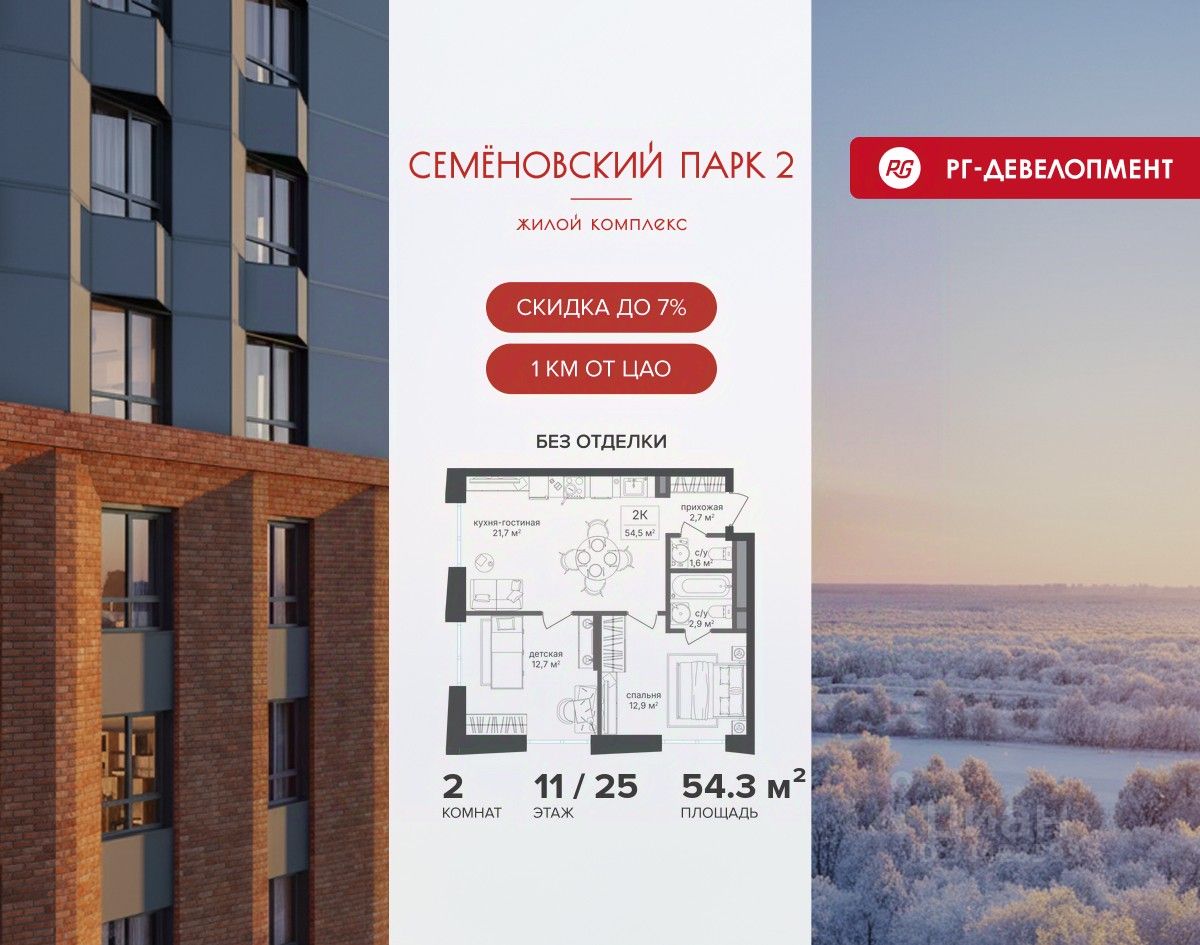Ипотека для каждого! Полная стоимость кредита от 13,192% до 17,149%. Ставка от 0,11% в АО ''Альфа-Банк'', ген. лицензия ЦБ РФ 1326 от 16.01.2015. Ставка фиксируется на первые 12 месяцев, далее полная стоимость кредита от 22,022% до 24,599% ставка 21,59%. Первоначальный взнос — от 20,1% от стоимости квартиры. Срок кредитования — от 4 до 30 лет. Ипотека на весь срок! Полная стоимость кредита от 23,396% до 26,058% со ставкой 14,5%! Первоначальный взнос —от 20,01% от стоимости квартиры. Срок кредитования — от 3 до 30 лет. АО ''Банк ДОМ.РФ'' универсальная лицензия Банка России 2312 от 19.12.2018. Скидка 7% при покупке квартиры! Цена указана с учетом максимального размера скидки. Продается 2-к квартира 54,3 кв.м. в ЖК ''Семеновский парк 2'' на 11-м этаже 25 этажного дома. Компания ''РГ-Девелопмент'' предоставляет скидку на квартиры в жилом комплексе. Акция действительна до 15.03.2026 включительно. Чтобы воспользоваться предложением, необходимо подписать договор на приобретение недвижимости до 15.03.2026 включительно. Компания ''РГ-Девелопмент'' вошла в ТОП-10 девелоперов по объёму введённого жилья в ''Старой Москве'' по итогам 2025 года. Прямая продажа от застройщика! Квартиры без отделки. Срок сдачи корпуса - 1 кв. 2026 г. ЖК ''Семеновский парк 2'' - это идеальное место для того, чтобы стать вашим домом. Проект расположен в исторической части Москвы вблизи Измайловского лесопарка, в 1 км от ЦАО. 4 станции метро отделяют вас от Красной площади и 15 минут на автомобиле - от Садового кольца.