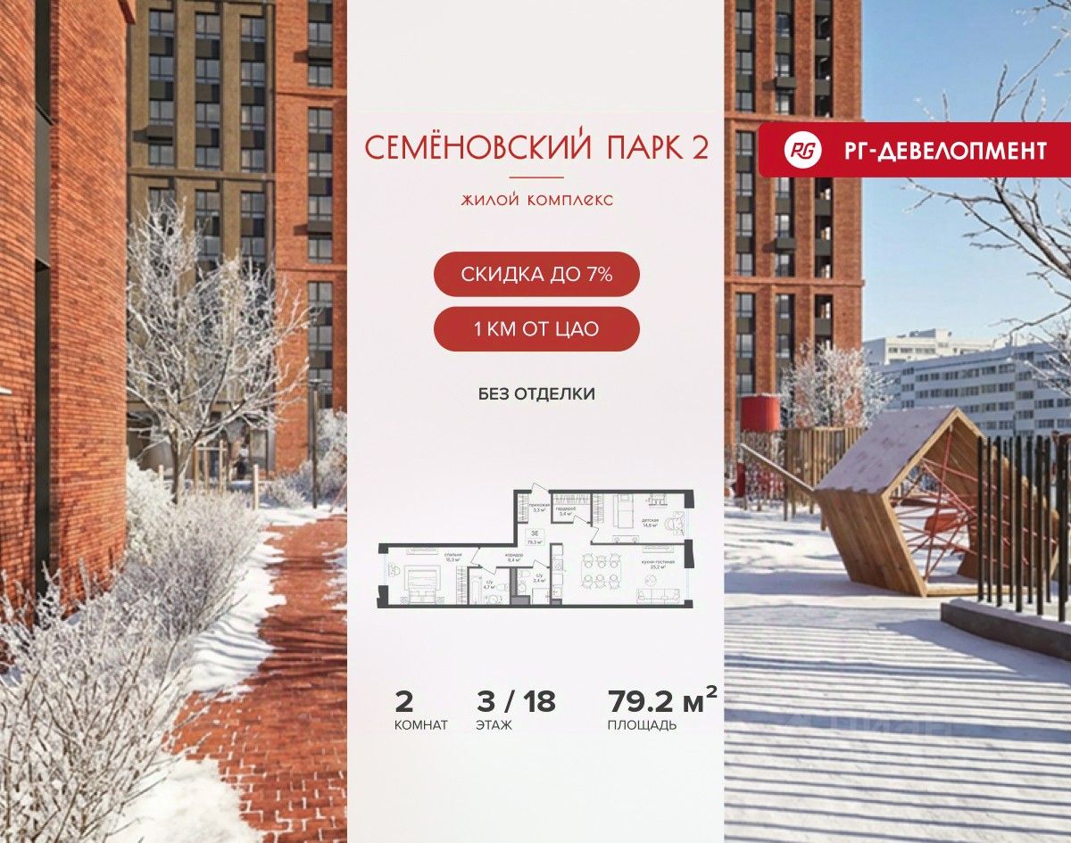Ипотека для каждого! Полная стоимость кредита от 13,192% до 17,149%. Ставка от 0,11% в АО ''Альфа-Банк'', ген. лицензия ЦБ РФ 1326 от 16.01.2015. Ставка фиксируется на первые 12 месяцев, далее полная стоимость кредита от 22,022% до 24,599% ставка 21,59%. Первоначальный взнос — от 20,1% от стоимости квартиры. Срок кредитования — от 4 до 30 лет. Ипотека на весь срок! Полная стоимость кредита от 23,396% до 26,058% со ставкой 14,5%! Первоначальный взнос —от 20,01% от стоимости квартиры. Срок кредитования — от 3 до 30 лет. АО ''Банк ДОМ.РФ'' универсальная лицензия Банка России 2312 от 19.12.2018. Скидка 7% при покупке квартиры! Цена указана с учетом максимального размера скидки. Продается 2-к квартира 79,2 кв.м. в ЖК ''Семеновский парк 2'' на 3-м этаже 18 этажного дома. Компания ''РГ-Девелопмент'' предоставляет скидку на квартиры в жилом комплексе. Акция действительна до 15.03.2026 включительно. Чтобы воспользоваться предложением, необходимо подписать договор на приобретение недвижимости до 15.03.2026 включительно. Компания ''РГ-Девелопмент'' вошла в ТОП-10 девелоперов по объёму введённого жилья в ''Старой Москве'' по итогам 2025 года. Прямая продажа от застройщика! Квартиры без отделки. Срок сдачи корпуса - 1 кв. 2026 г. ЖК ''Семеновский парк 2'' - это идеальное место для того, чтобы стать вашим домом. Проект расположен в исторической части Москвы вблизи Измайловского лесопарка, в 1 км от ЦАО. 4 станции метро отделяют вас от Красной площади и 15 минут на автомобиле - от Садового кольца.