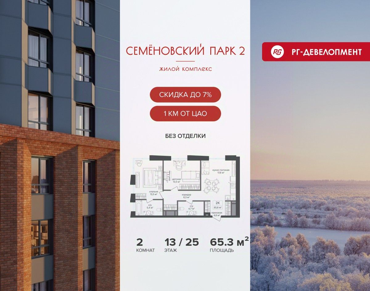 Ипотека для каждого! Полная стоимость кредита от 13,192% до 17,149%. Ставка от 0,11% в АО ''Альфа-Банк'', ген. лицензия ЦБ РФ 1326 от 16.01.2015. Ставка фиксируется на первые 12 месяцев, далее полная стоимость кредита от 22,022% до 24,599% ставка 21,59%. Первоначальный взнос — от 20,1% от стоимости квартиры. Срок кредитования — от 4 до 30 лет. Ипотека на весь срок! Полная стоимость кредита от 23,396% до 26,058% со ставкой 14,5%! Первоначальный взнос —от 20,01% от стоимости квартиры. Срок кредитования — от 3 до 30 лет. АО ''Банк ДОМ.РФ'' универсальная лицензия Банка России 2312 от 19.12.2018. Скидка 7% при покупке квартиры! Цена указана с учетом максимального размера скидки. Продается 2-к квартира 65,7 кв.м. в ЖК ''Семеновский парк 2'' на 13-м этаже 25 этажного дома. Компания ''РГ-Девелопмент'' предоставляет скидку на квартиры в жилом комплексе. Акция действительна до 15.03.2026 включительно. Чтобы воспользоваться предложением, необходимо подписать договор на приобретение недвижимости до 15.03.2026 включительно. Компания ''РГ-Девелопмент'' вошла в ТОП-10 девелоперов по объёму введённого жилья в ''Старой Москве'' по итогам 2025 года. Прямая продажа от застройщика! Квартиры без отделки. Срок сдачи корпуса - 1 кв. 2026 г. ЖК ''Семеновский парк 2'' - это идеальное место для того, чтобы стать вашим домом. Проект расположен в исторической части Москвы вблизи Измайловского лесопарка, в 1 км от ЦАО. 4 станции метро отделяют вас от Красной площади и 15 минут на автомобиле - от Садового кольца.