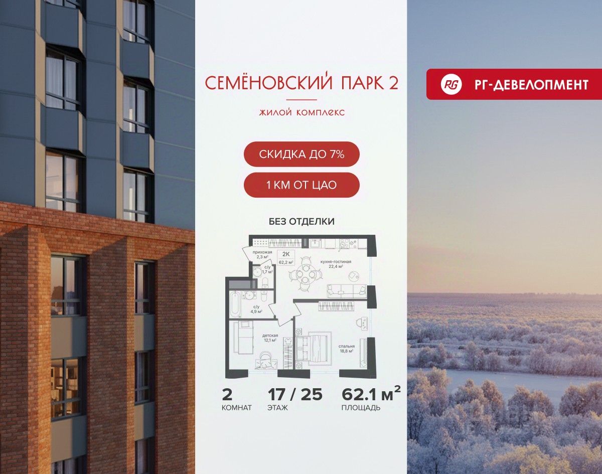 Ипотека для каждого! Полная стоимость кредита от 13,192% до 17,149%. Ставка от 0,11% в АО ''Альфа-Банк'', ген. лицензия ЦБ РФ 1326 от 16.01.2015. Ставка фиксируется на первые 12 месяцев, далее полная стоимость кредита от 22,022% до 24,599% ставка 21,59%. Первоначальный взнос — от 20,1% от стоимости квартиры. Срок кредитования — от 4 до 30 лет. Ипотека на весь срок! Полная стоимость кредита от 23,396% до 26,058% со ставкой 14,5%! Первоначальный взнос —от 20,01% от стоимости квартиры. Срок кредитования — от 3 до 30 лет. АО ''Банк ДОМ.РФ'' универсальная лицензия Банка России 2312 от 19.12.2018. Скидка 7% при покупке квартиры! Цена указана с учетом максимального размера скидки. Продается 2-к квартира 62,1 кв.м. в ЖК ''Семеновский парк 2'' на 17-м этаже 25 этажного дома. Компания ''РГ-Девелопмент'' предоставляет скидку на квартиры в жилом комплексе. Акция действительна до 15.03.2026 включительно. Чтобы воспользоваться предложением, необходимо подписать договор на приобретение недвижимости до 15.03.2026 включительно. Компания ''РГ-Девелопмент'' вошла в ТОП-10 девелоперов по объёму введённого жилья в ''Старой Москве'' по итогам 2025 года. Прямая продажа от застройщика! Квартиры без отделки. Срок сдачи корпуса - 1 кв. 2026 г. ЖК ''Семеновский парк 2'' - это идеальное место для того, чтобы стать вашим домом. Проект расположен в исторической части Москвы вблизи Измайловского лесопарка, в 1 км от ЦАО. 4 станции метро отделяют вас от Красной площади и 15 минут на автомобиле - от Садового кольца.