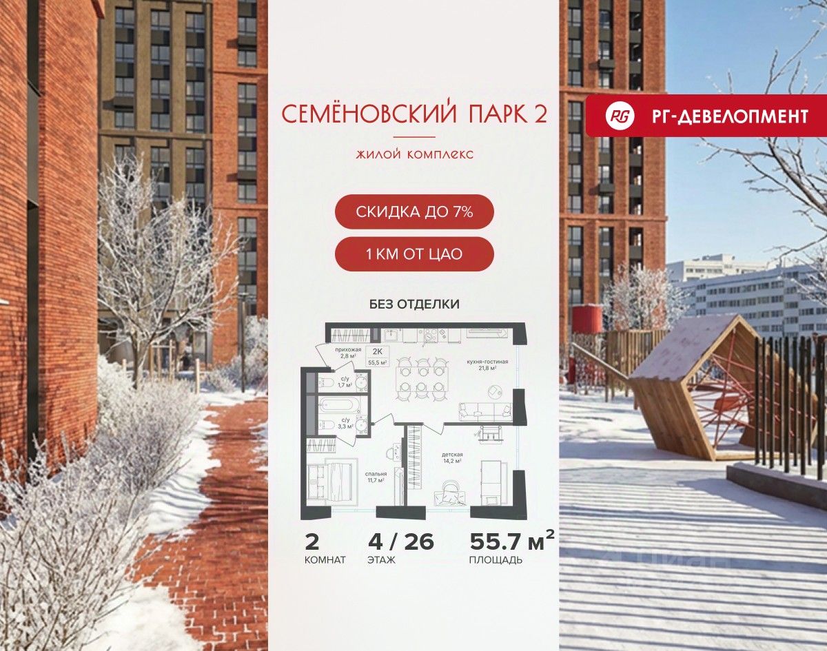 Ипотека для каждого! Полная стоимость кредита от 13,192% до 17,149%. Ставка от 0,11% в АО ''Альфа-Банк'', ген. лицензия ЦБ РФ 1326 от 16.01.2015. Ставка фиксируется на первые 12 месяцев, далее полная стоимость кредита от 22,022% до 24,599% ставка 21,59%. Первоначальный взнос — от 20,1% от стоимости квартиры. Срок кредитования — от 4 до 30 лет. Ипотека на весь срок! Полная стоимость кредита от 23,396% до 26,058% со ставкой 14,5%! Первоначальный взнос —от 20,01% от стоимости квартиры. Срок кредитования — от 3 до 30 лет. АО ''Банк ДОМ.РФ'' универсальная лицензия Банка России 2312 от 19.12.2018. Скидка 7% при покупке квартиры! Цена указана с учетом максимального размера скидки. Продается 2-к квартира 55,5 кв.м. в ЖК ''Семеновский парк 2'' на 4-м этаже 26 этажного дома. Компания ''РГ-Девелопмент'' предоставляет скидку на квартиры в жилом комплексе. Акция действительна до 15.03.2026 включительно. Чтобы воспользоваться предложением, необходимо подписать договор на приобретение недвижимости до 15.03.2026 включительно. Компания ''РГ-Девелопмент'' вошла в ТОП-10 девелоперов по объёму введённого жилья в ''Старой Москве'' по итогам 2025 года. Прямая продажа от застройщика! Квартиры без отделки. Срок сдачи корпуса - 1 кв. 2026 г. ЖК ''Семеновский парк 2'' - это идеальное место для того, чтобы стать вашим домом. Проект расположен в исторической части Москвы вблизи Измайловского лесопарка, в 1 км от ЦАО. 4 станции метро отделяют вас от Красной площади и 15 минут на автомобиле - от Садового кольца.