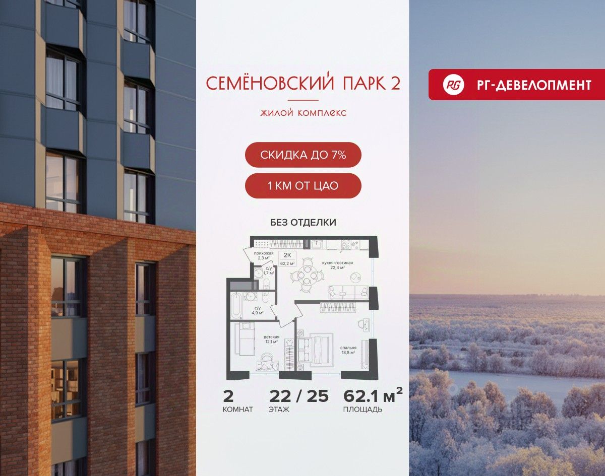 Ипотека для каждого! Полная стоимость кредита от 13,192% до 17,149%. Ставка от 0,11% в АО ''Альфа-Банк'', ген. лицензия ЦБ РФ 1326 от 16.01.2015. Ставка фиксируется на первые 12 месяцев, далее полная стоимость кредита от 22,022% до 24,599% ставка 21,59%. Первоначальный взнос — от 20,1% от стоимости квартиры. Срок кредитования — от 4 до 30 лет. Ипотека на весь срок! Полная стоимость кредита от 23,396% до 26,058% со ставкой 14,5%! Первоначальный взнос —от 20,01% от стоимости квартиры. Срок кредитования — от 3 до 30 лет. АО ''Банк ДОМ.РФ'' универсальная лицензия Банка России 2312 от 19.12.2018. Скидка 7% при покупке квартиры! Цена указана с учетом максимального размера скидки. Продается 2-к квартира 62,1 кв.м. в ЖК ''Семеновский парк 2'' на 12-м этаже 25 этажного дома. Компания ''РГ-Девелопмент'' предоставляет скидку на квартиры в жилом комплексе. Акция действительна до 15.03.2026 включительно. Чтобы воспользоваться предложением, необходимо подписать договор на приобретение недвижимости до 15.03.2026 включительно. Компания ''РГ-Девелопмент'' вошла в ТОП-10 девелоперов по объёму введённого жилья в ''Старой Москве'' по итогам 2025 года. Прямая продажа от застройщика! Квартиры без отделки. Срок сдачи корпуса - 1 кв. 2026 г. ЖК ''Семеновский парк 2'' - это идеальное место для того, чтобы стать вашим домом. Проект расположен в исторической части Москвы вблизи Измайловского лесопарка, в 1 км от ЦАО. 4 станции метро отделяют вас от Красной площади и 15 минут на автомобиле - от Садового кольца.
