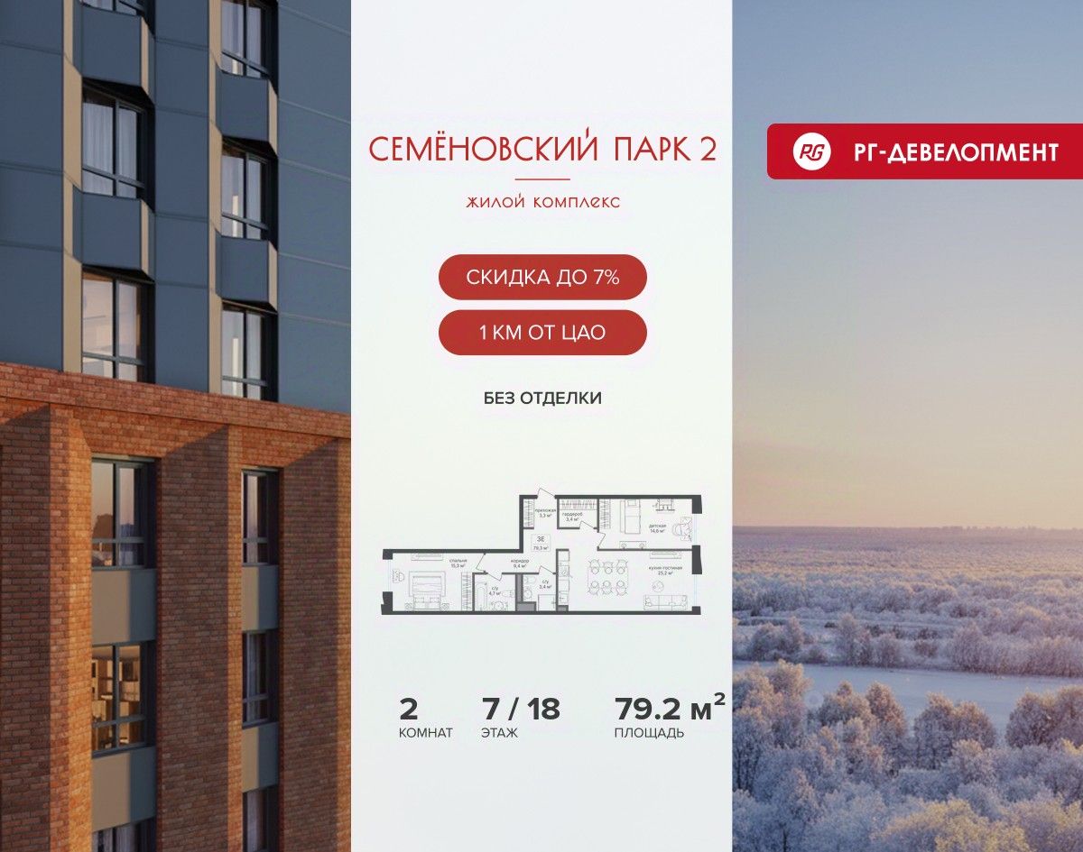 Ипотека для каждого! Полная стоимость кредита от 13,192% до 17,149%. Ставка от 0,11% в АО ''Альфа-Банк'', ген. лицензия ЦБ РФ 1326 от 16.01.2015. Ставка фиксируется на первые 12 месяцев, далее полная стоимость кредита от 22,022% до 24,599% ставка 21,59%. Первоначальный взнос — от 20,1% от стоимости квартиры. Срок кредитования — от 4 до 30 лет. Ипотека на весь срок! Полная стоимость кредита от 23,396% до 26,058% со ставкой 14,5%! Первоначальный взнос —от 20,01% от стоимости квартиры. Срок кредитования — от 3 до 30 лет. АО ''Банк ДОМ.РФ'' универсальная лицензия Банка России 2312 от 19.12.2018. Скидка 7% при покупке квартиры! Цена указана с учетом максимального размера скидки. Продается 2-к квартира 79,0 кв.м. в ЖК ''Семеновский парк 2'' на 7-м этаже 18 этажного дома. Компания ''РГ-Девелопмент'' предоставляет скидку на квартиры в жилом комплексе. Акция действительна до 15.03.2026 включительно. Чтобы воспользоваться предложением, необходимо подписать договор на приобретение недвижимости до 15.03.2026 включительно. Компания ''РГ-Девелопмент'' вошла в ТОП-10 девелоперов по объёму введённого жилья в ''Старой Москве'' по итогам 2025 года. Прямая продажа от застройщика! Квартиры без отделки. Срок сдачи корпуса - 1 кв. 2026 г. ЖК ''Семеновский парк 2'' - это идеальное место для того, чтобы стать вашим домом. Проект расположен в исторической части Москвы вблизи Измайловского лесопарка, в 1 км от ЦАО. 4 станции метро отделяют вас от Красной площади и 15 минут на автомобиле - от Садового кольца.