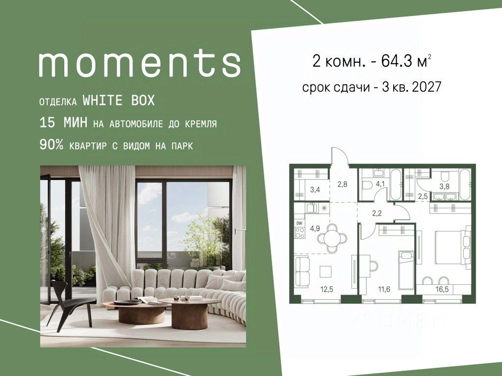 Цены указаны с условием 100% оплаты и стандартной ипотеки. Продается 2-к. квартира номер 676 общей площадью 65 кв.м. на 24-м этаже 40 этажного дома, корпус 2.3. С отделкой White Box. Moments — ЖК бизнес-класса, расположен на расстоянии вытянутой руки от старинного усадебного парка Покровское-Стрешнево. Moments — это единение города и природы, дом, который помогает обрести гармонию и баланс в жизни. Moments расположен на Волоколамском шоссе с удобным выездом в центр и в область, а также с расположенными в пешей доступности объектами транспортной инфраструктуры (МЦК и МЦД-2). Жилой комплекс будет состоять из 3 очередей — 8 корпусов высотой от 4 до 47 этажей. Здания будут расположены под разными углами для максимальной открытости солнцу и максимально роскошным видовым характеристикам. Внутренний двор: Иммерсивное благоустройство от британского бюро Gillespies и West8 сфокусировано на эмоциональном и чувственном опыте. Каждая прогулка по Moments погружает в путешествие со сменой сценариев и плавным потоком уникальных моментов. - Пешеходная экотропа,которая соединяет комплекс с парком Покровское-Стрешнево - Двор с фонтаном - Зеленые сады и лаунж-зоны - Пространства для пикников и общения - Зоны активного отдыха. Детские и спортивные площадки - Пешеходные тропы и велодорожки - Разнообразная коммерческая инфраструктура - Детский сад на 175 мест - Школа на 300 мест - Игровые площадки из натуральных материалов - Сенсорные сады - Безбарьерное зонирование