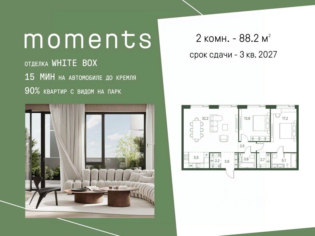 Цены указаны с условием 100% оплаты и стандартной ипотеки. Продается 2-к. квартира номер 851 общей площадью 88.2 кв.м. на 40-м этаже 40 этажного дома, корпус 2.3. С отделкой White Box. Moments — ЖК бизнес-класса, расположен на расстоянии вытянутой руки от старинного усадебного парка Покровское-Стрешнево. Moments — это единение города и природы, дом, который помогает обрести гармонию и баланс в жизни. Moments расположен на Волоколамском шоссе с удобным выездом в центр и в область, а также с расположенными в пешей доступности объектами транспортной инфраструктуры (МЦК и МЦД-2). Жилой комплекс будет состоять из 3 очередей — 8 корпусов высотой от 4 до 47 этажей. Здания будут расположены под разными углами для максимальной открытости солнцу и максимально роскошным видовым характеристикам. Внутренний двор: Иммерсивное благоустройство от британского бюро Gillespies и West8 сфокусировано на эмоциональном и чувственном опыте. Каждая прогулка по Moments погружает в путешествие со сменой сценариев и плавным потоком уникальных моментов. - Пешеходная экотропа,которая соединяет комплекс с парком Покровское-Стрешнево - Двор с фонтаном - Зеленые сады и лаунж-зоны - Пространства для пикников и общения - Зоны активного отдыха. Детские и спортивные площадки - Пешеходные тропы и велодорожки - Разнообразная коммерческая инфраструктура - Детский сад на 175 мест - Школа на 300 мест - Игровые площадки из натуральных материалов - Сенсорные сады - Безбарьерное зонирование